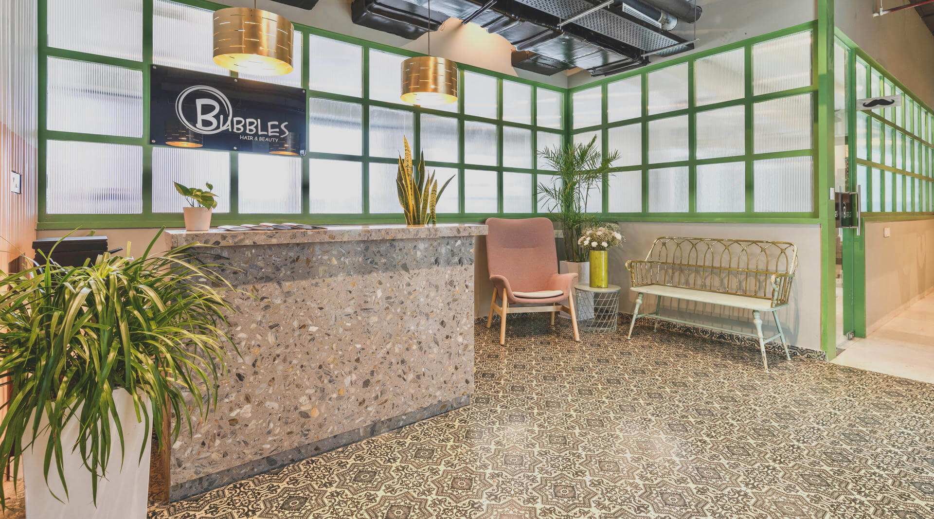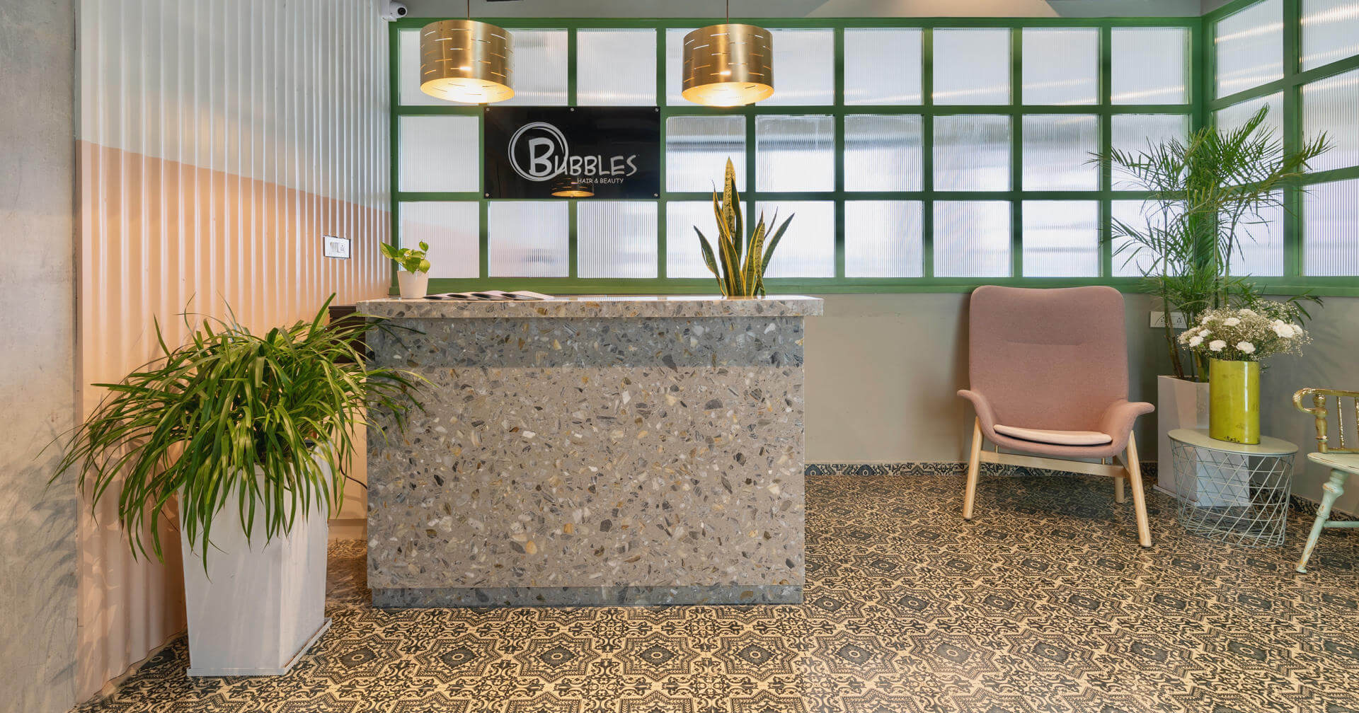 The main challenge here was the height of the space that we tackled with using a black rock wool ceiling and partially gold mirror.