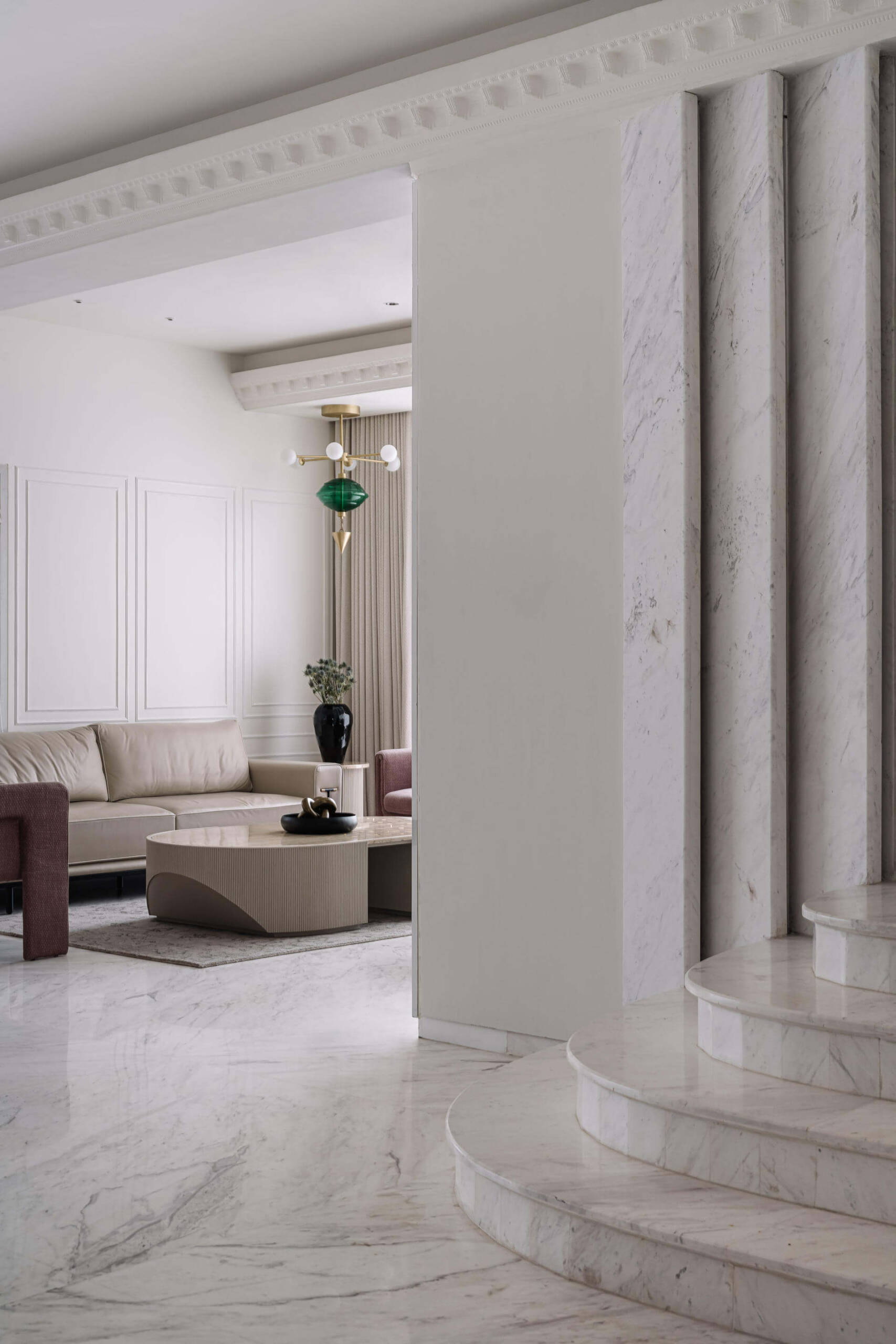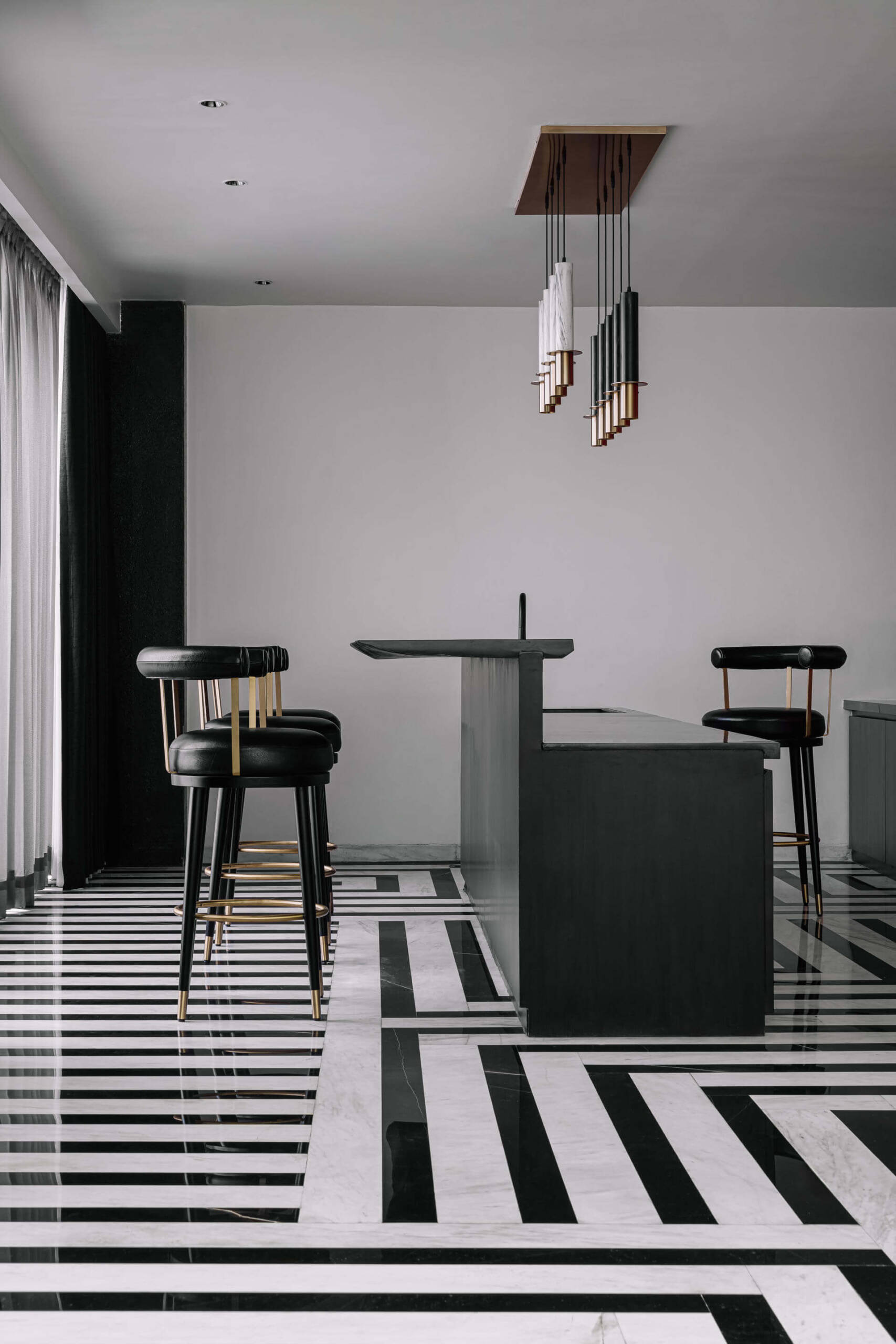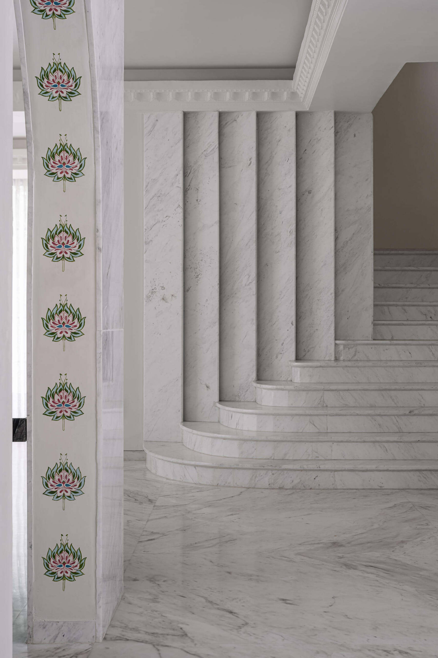 The flooring was a meticulous labor of love that went through many trial and errors to get to this stage! The standard ash grey stone was procured in large sizes, shaped and chiseled in the factory, finished multiple times on all sides with a machine and with sealant and then laid over a few months and finally filled with a white epoxy in between!