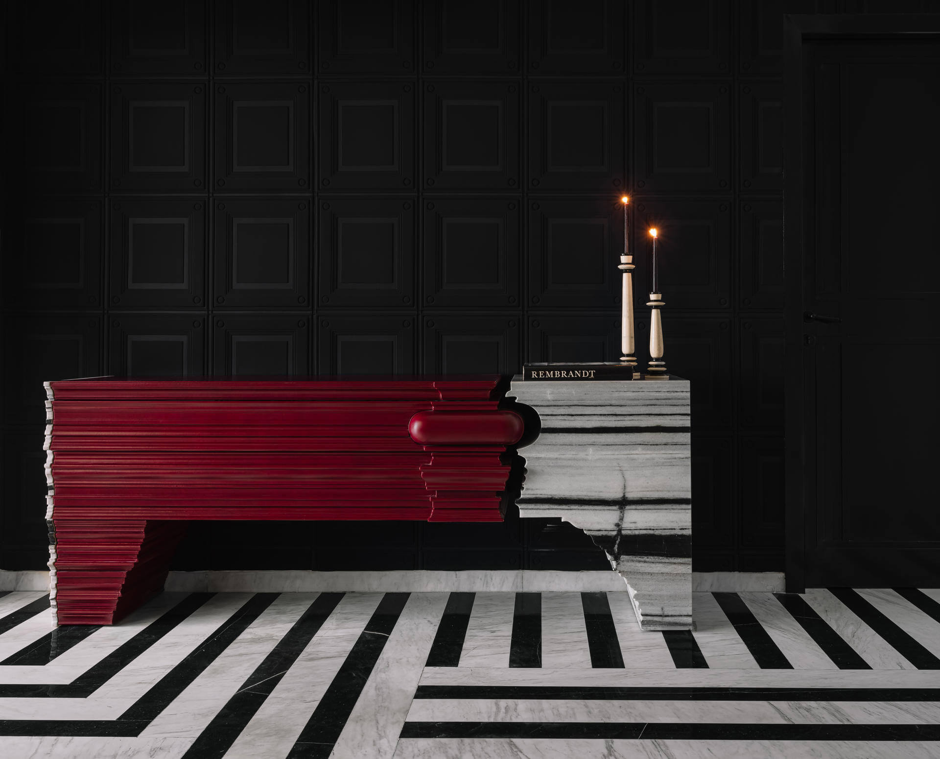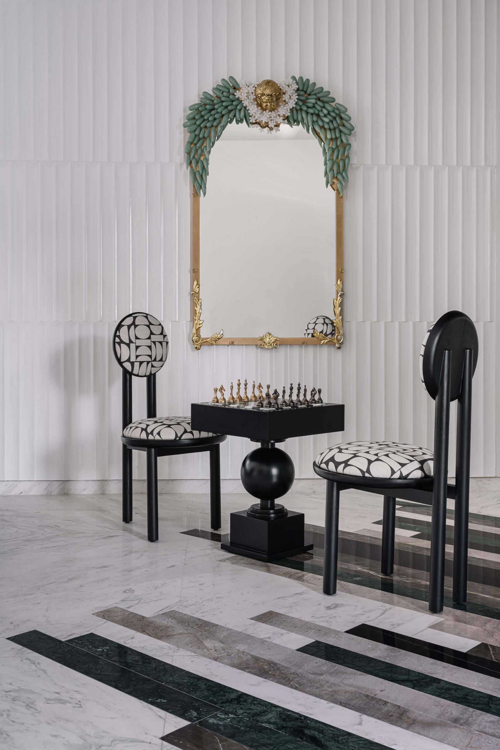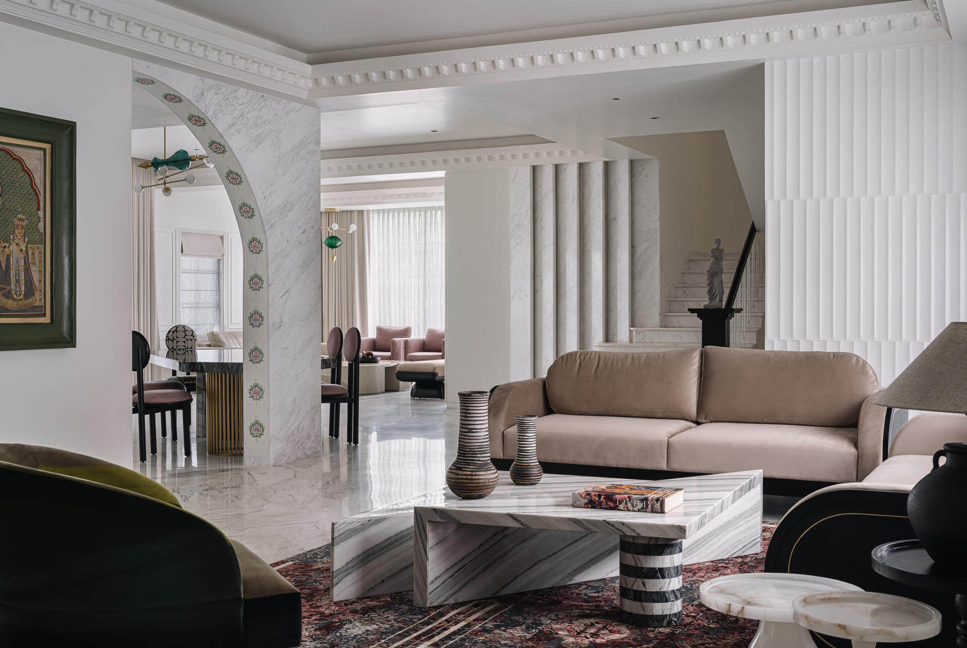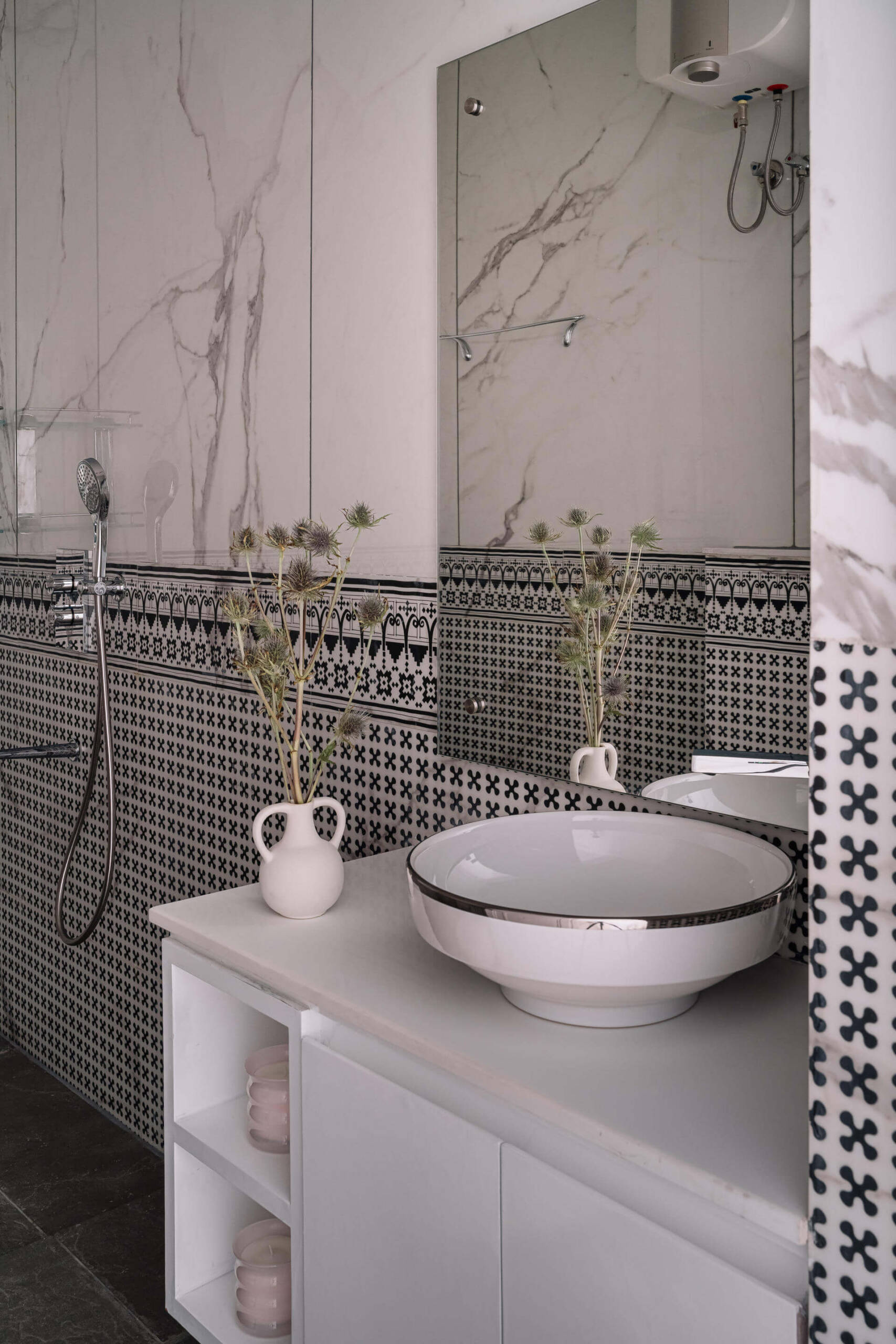 The flooring was a meticulous labor of love that went through many trial and errors to get to this stage! The standard ash grey stone was procured in large sizes, shaped and chiseled in the factory, finished multiple times on all sides with a machine and with sealant and then laid over a few months and finally filled with a white epoxy in between!