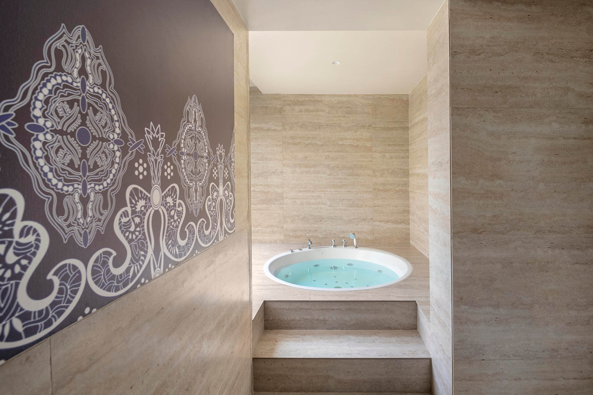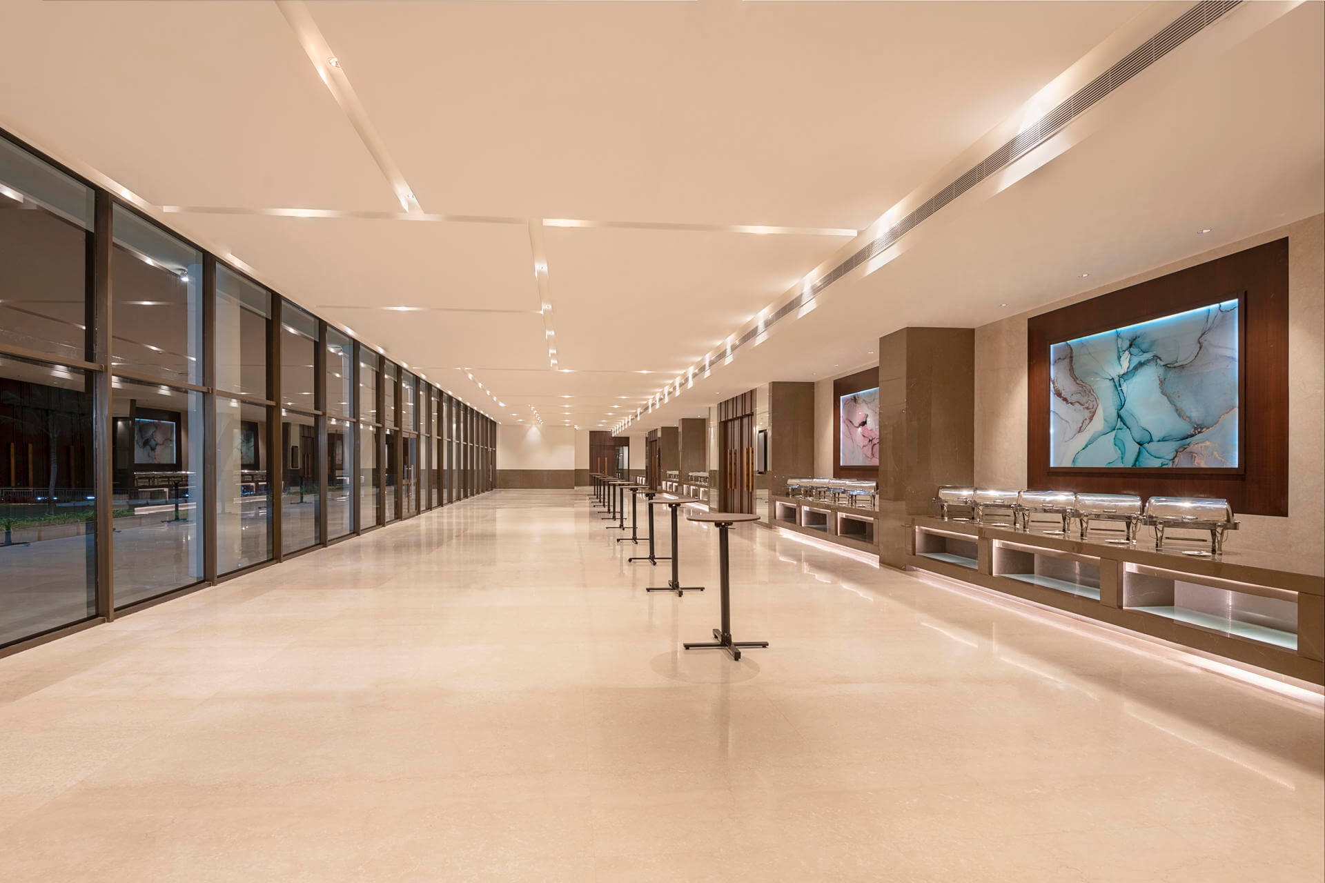 The flooring was a meticulous labor of love that went through many trial and errors to get to this stage! The standard ash grey stone was procured in large sizes, shaped and chiseled in the factory, finished multiple times on all sides with a machine and with sealant and then laid over a few months and finally filled with a white epoxy in between!