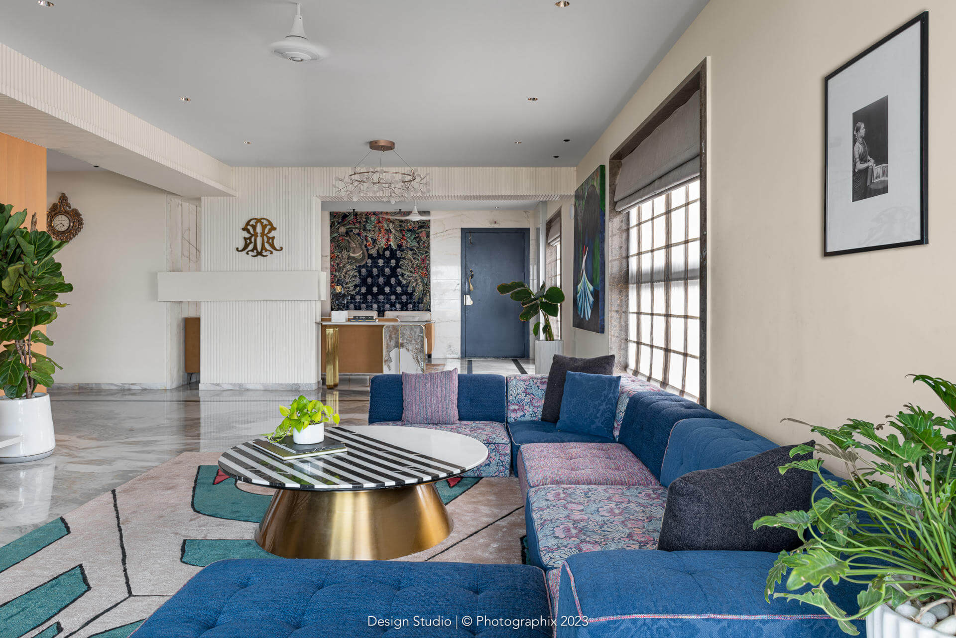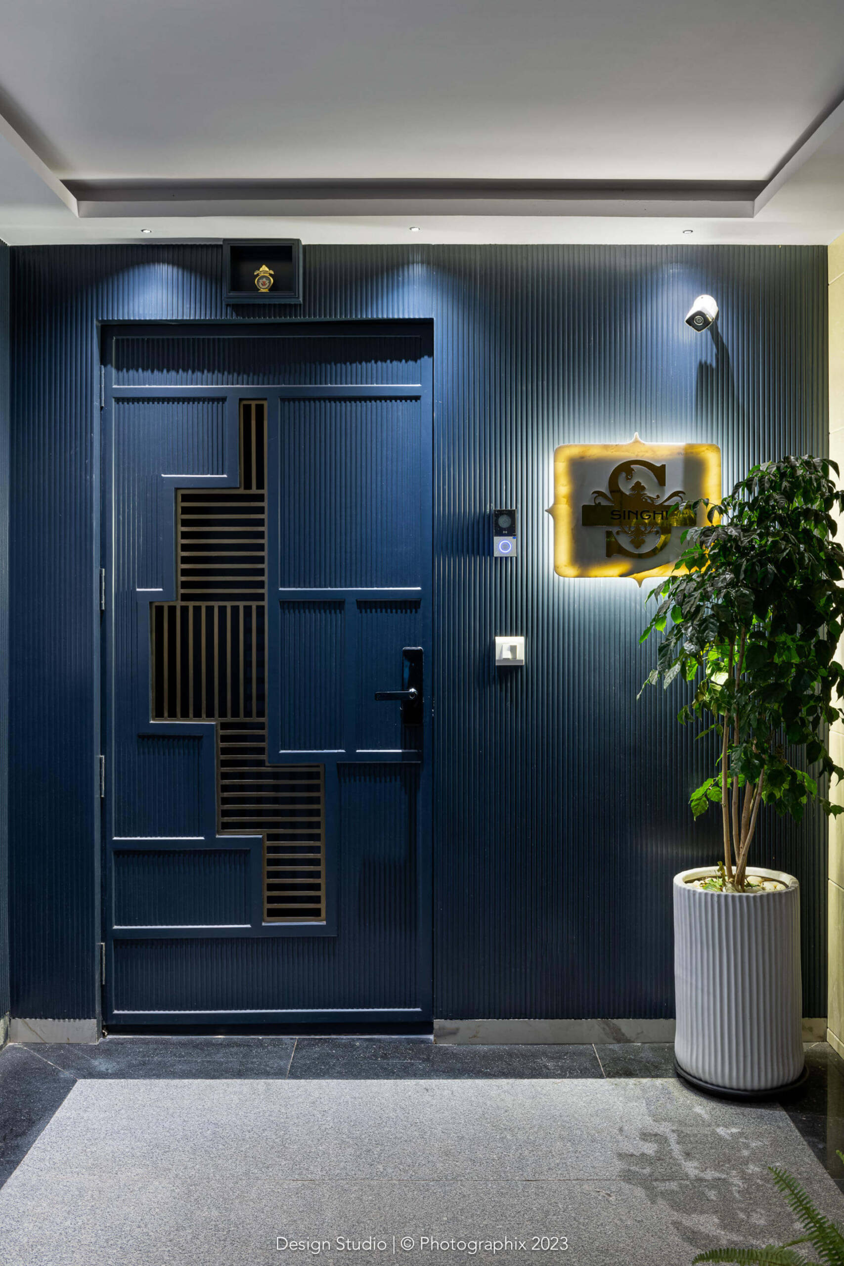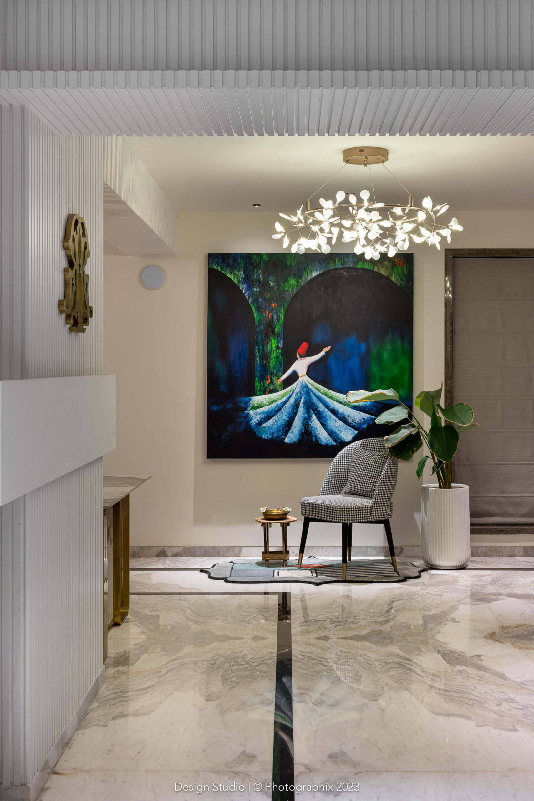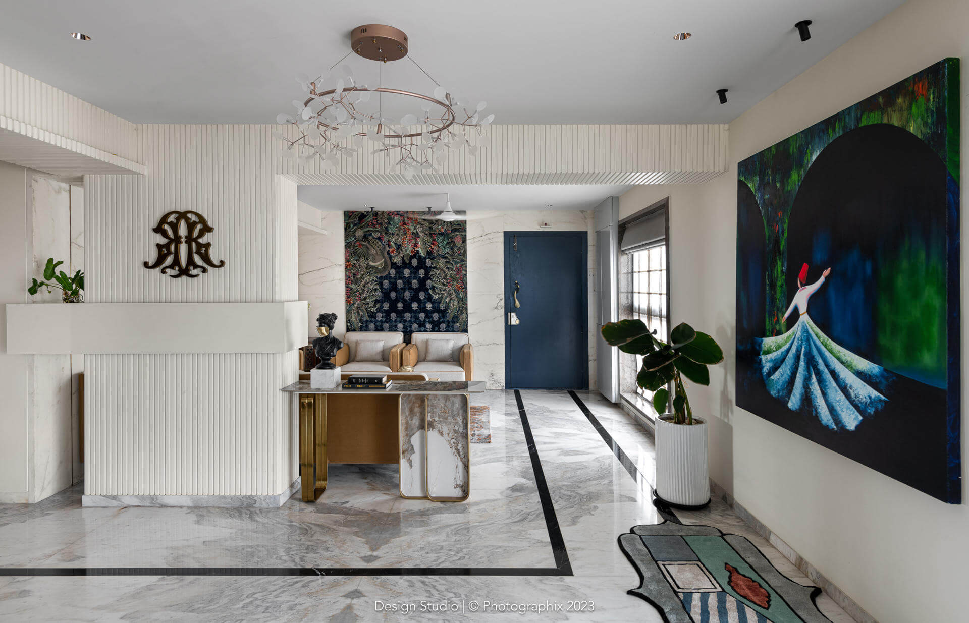 The flooring was a meticulous labor of love that went through many trial and errors to get to this stage! The standard ash grey stone was procured in large sizes, shaped and chiseled in the factory, finished multiple times on all sides with a machine and with sealant and then laid over a few months and finally filled with a white epoxy in between!