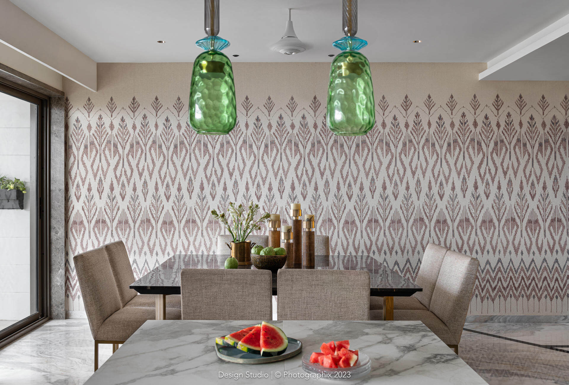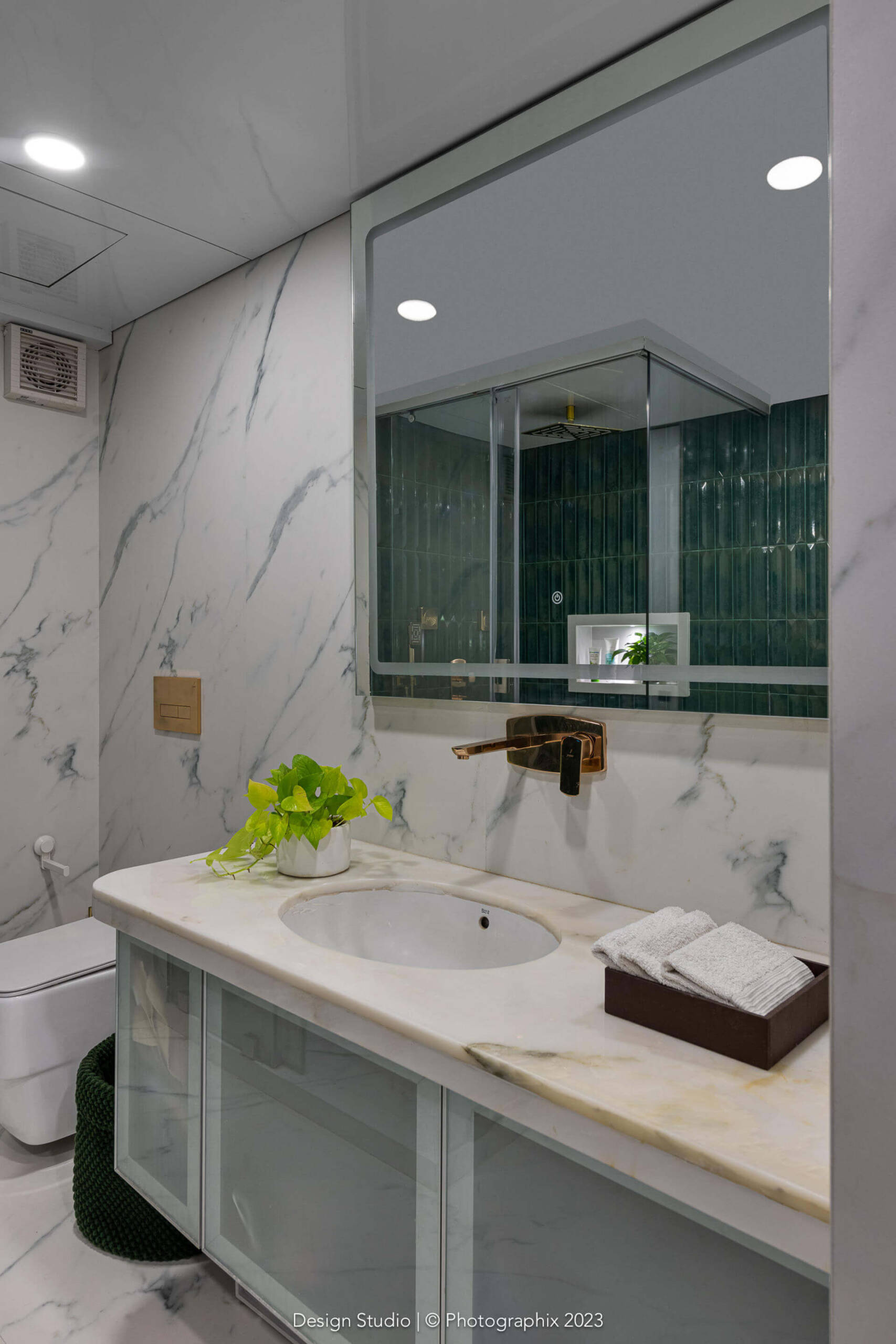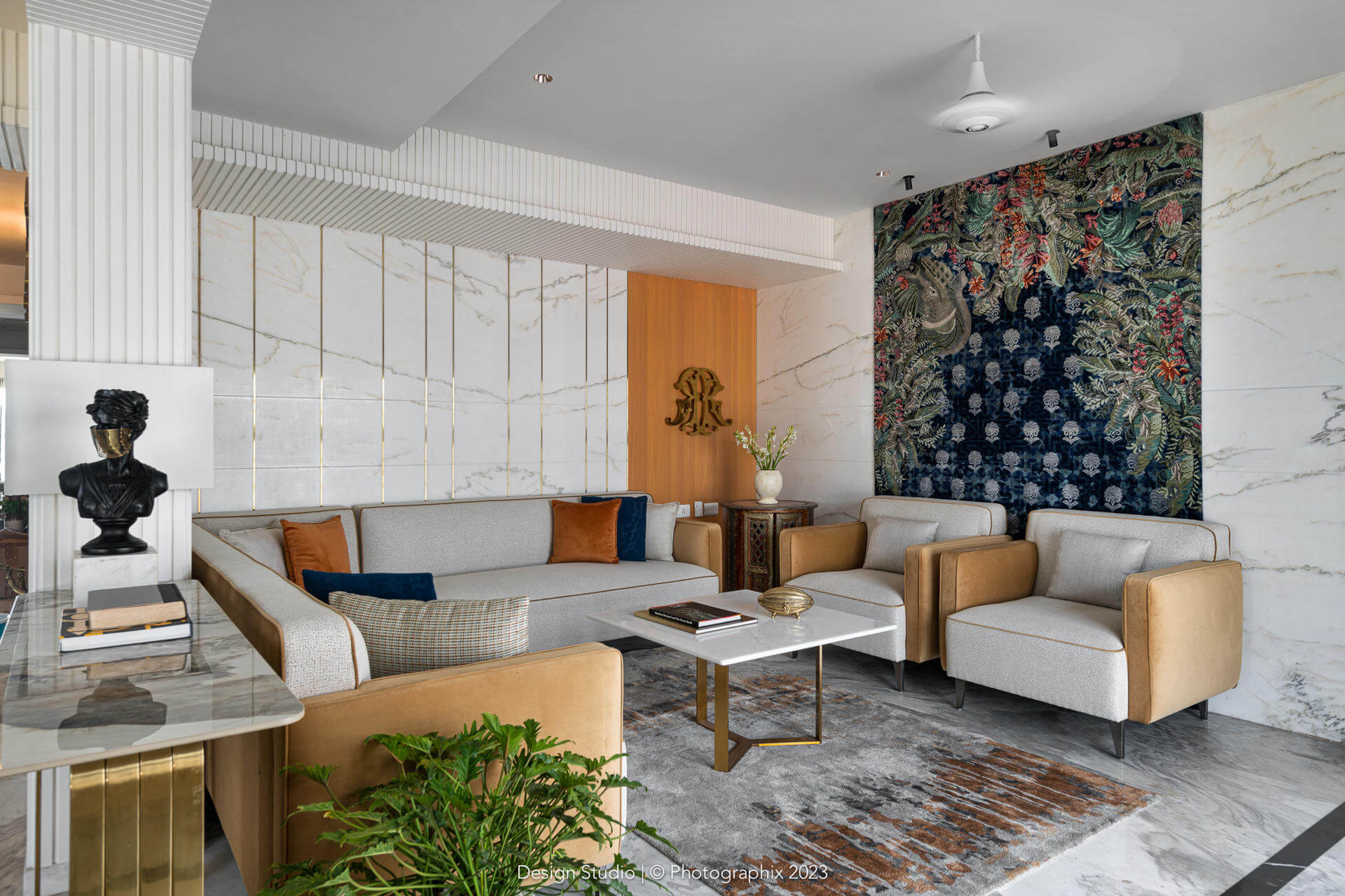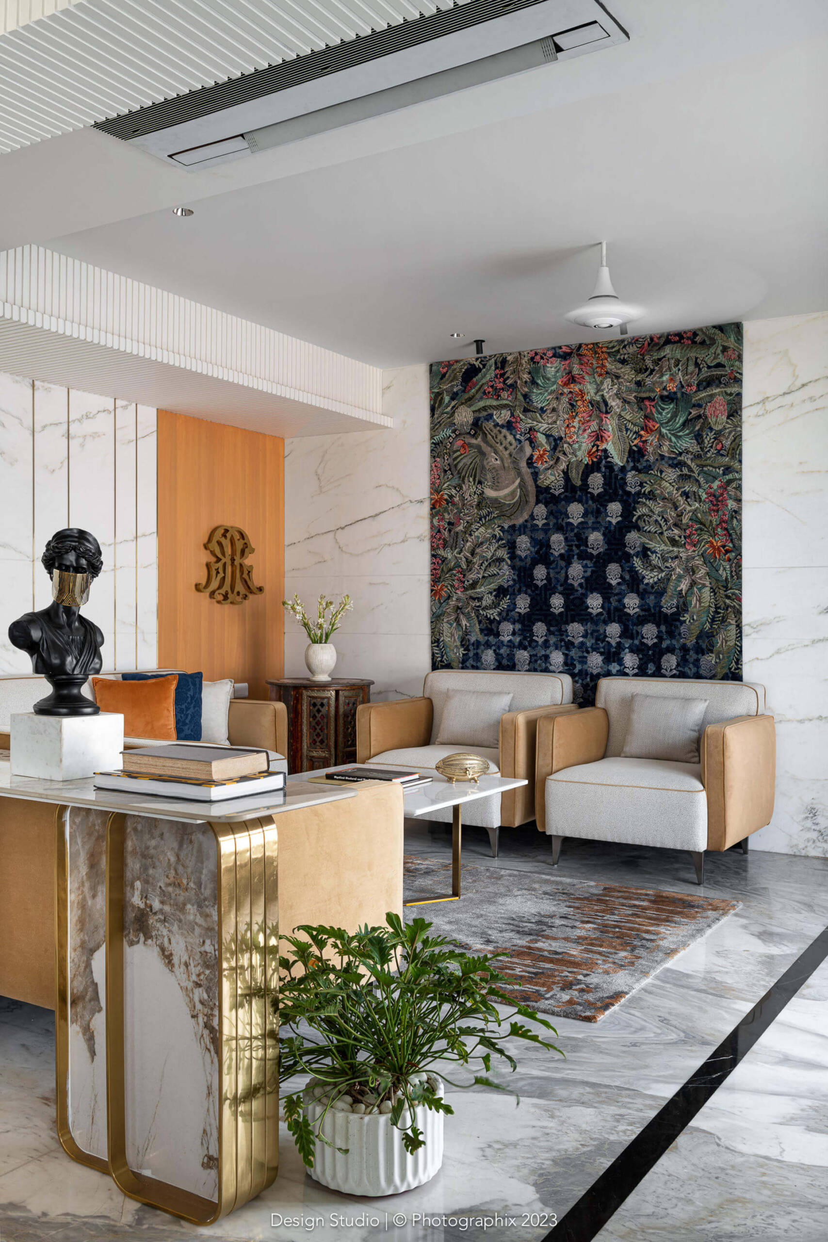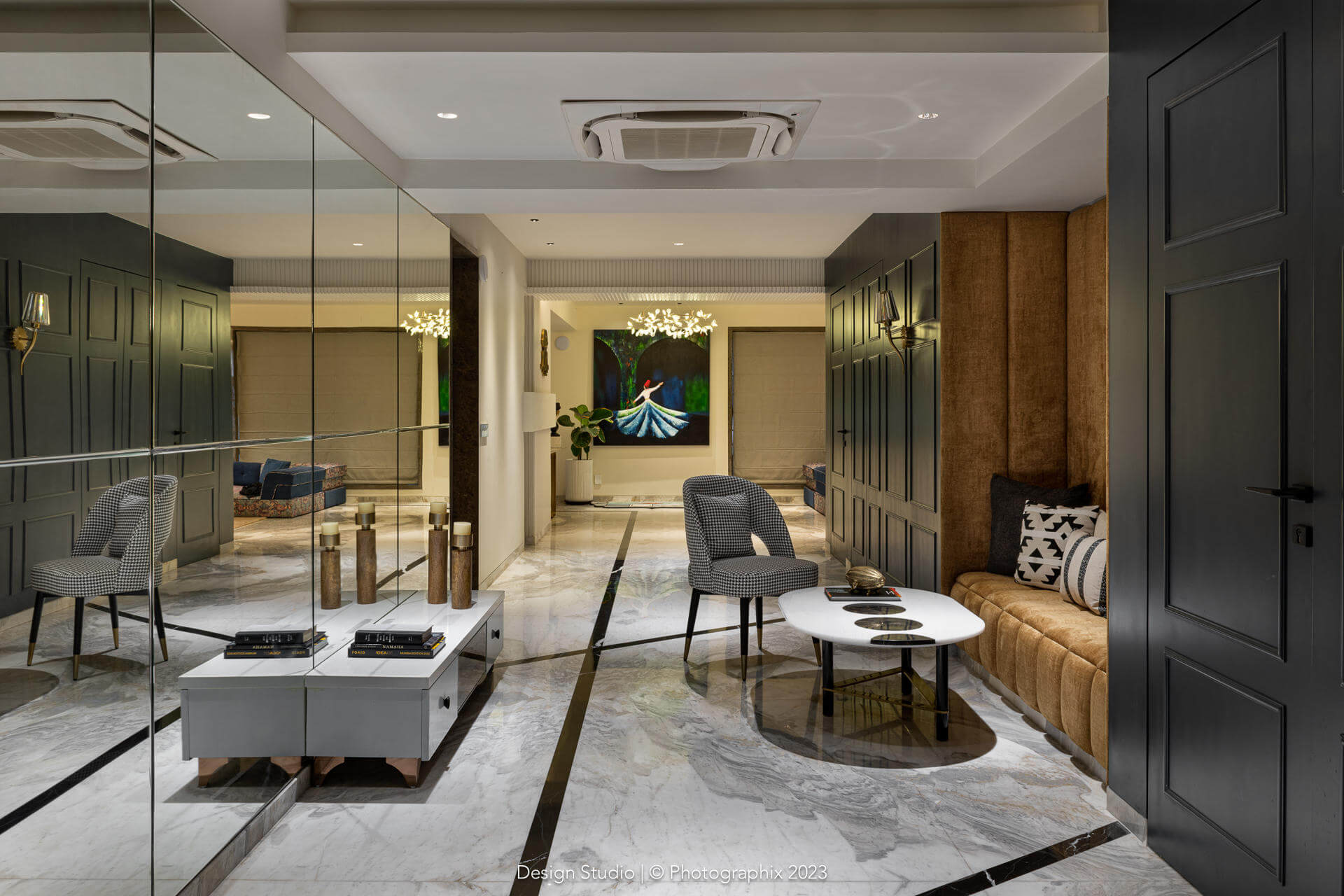 The flooring was a meticulous labor of love that went through many trial and errors to get to this stage! The standard ash grey stone was procured in large sizes, shaped and chiseled in the factory, finished multiple times on all sides with a machine and with sealant and then laid over a few months and finally filled with a white epoxy in between!