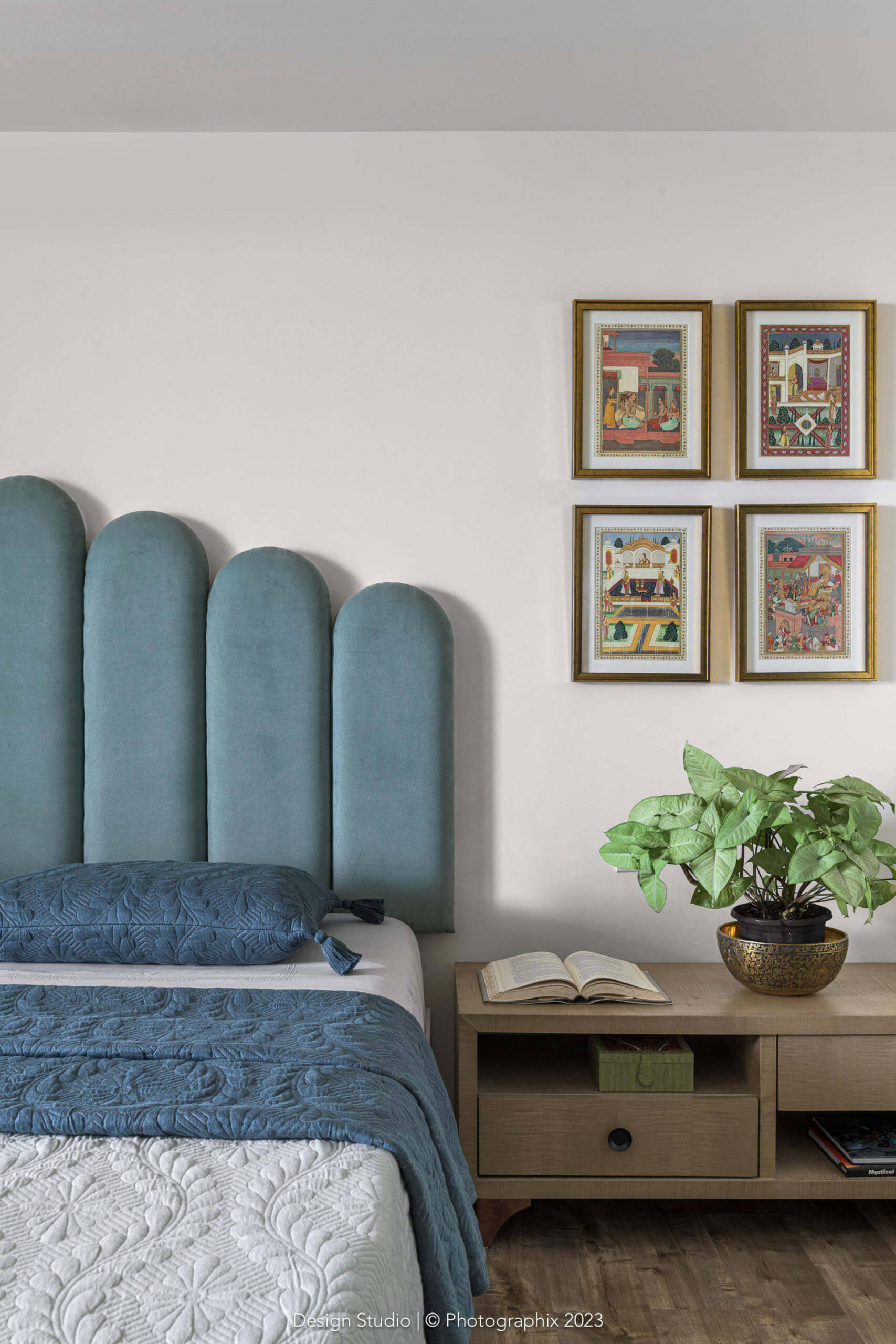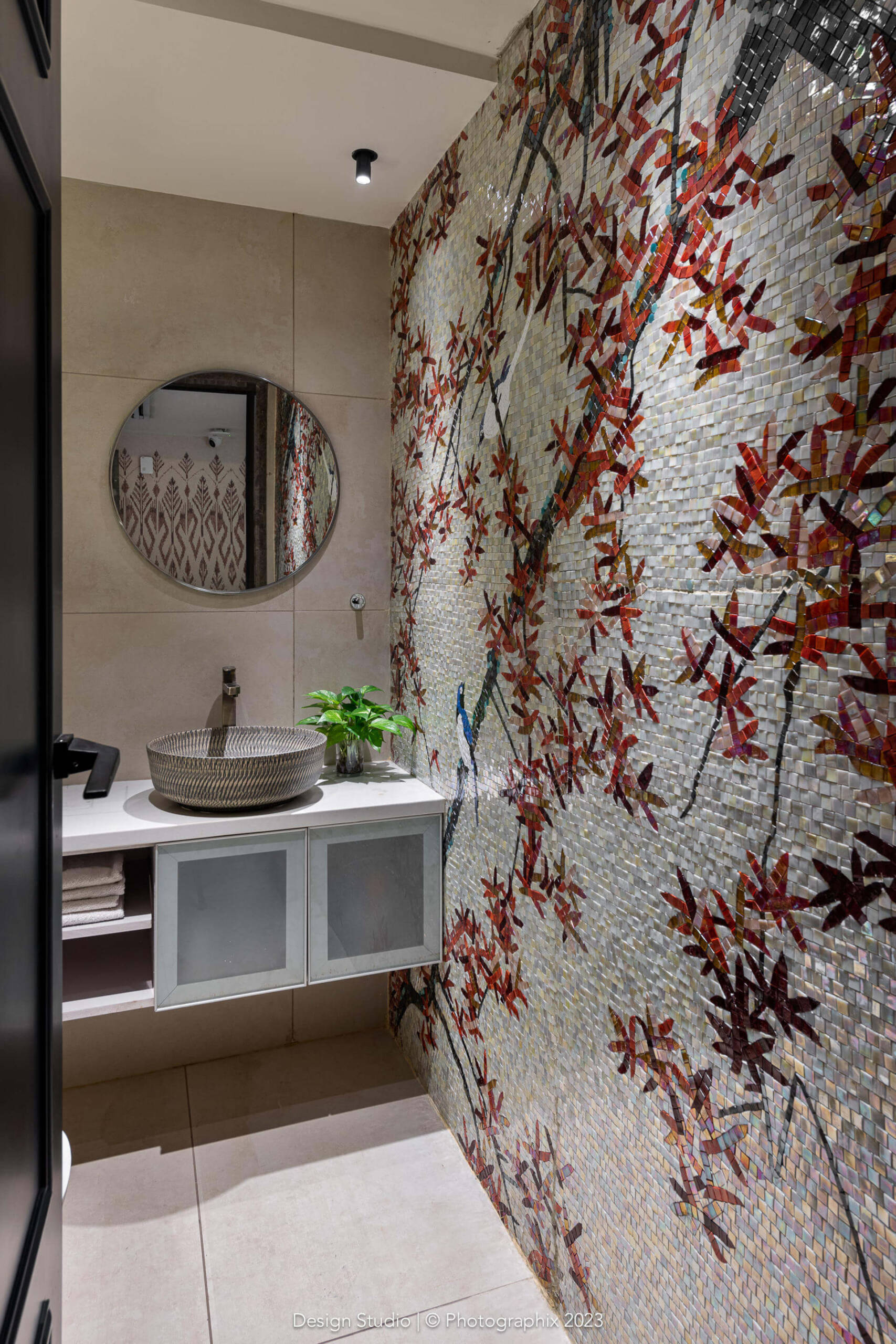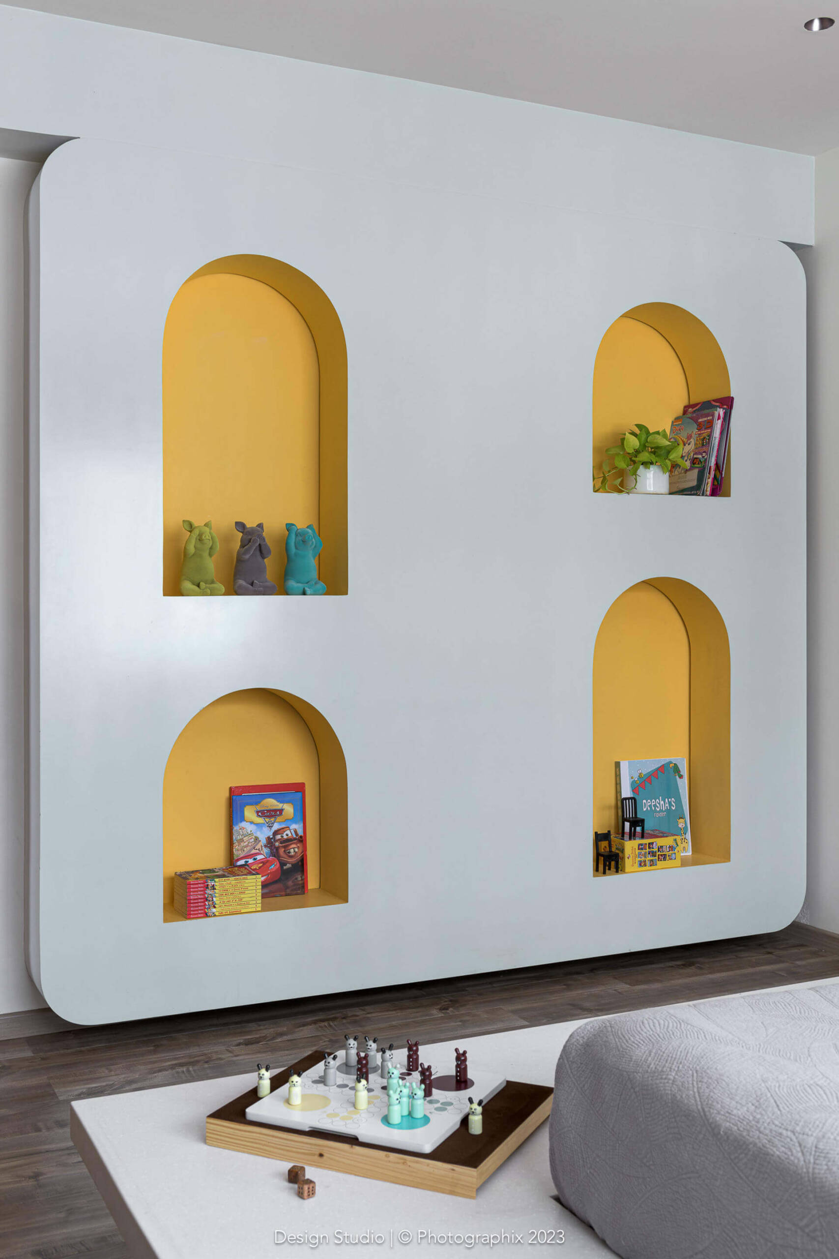Likewise, the walls are not your generic texture! The undulations and levels have been achieved at the time of doing the civil work itself. Layers of cement, innumerable site visits to achieve the shapes and many costs of plaster of Paris and texture material later, we managed to achieve a finish that looks natural to the eye and soft to the touch!