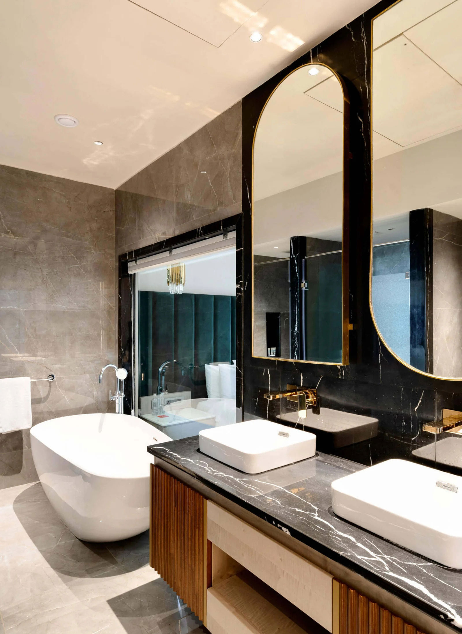 The flooring was a meticulous labor of love that went through many trial and errors to get to this stage! The standard ash grey stone was procured in large sizes, shaped and chiseled in the factory, finished multiple times on all sides with a machine and with sealant and then laid over a few months and finally filled with a white epoxy in between!
