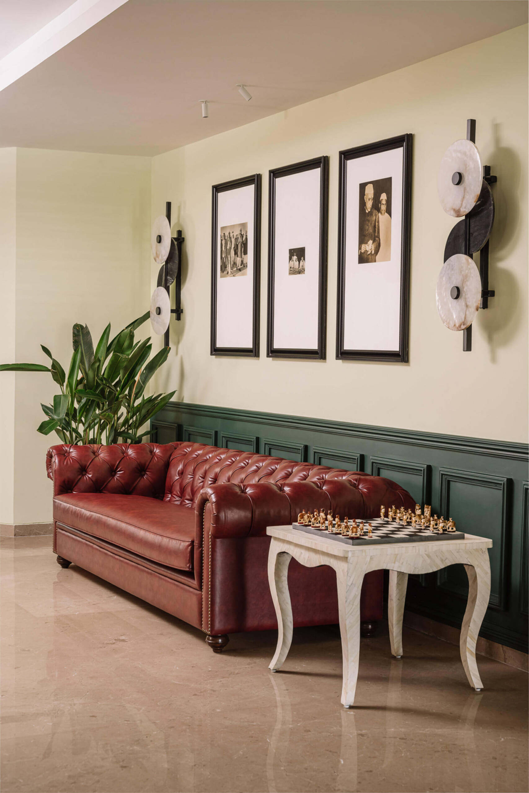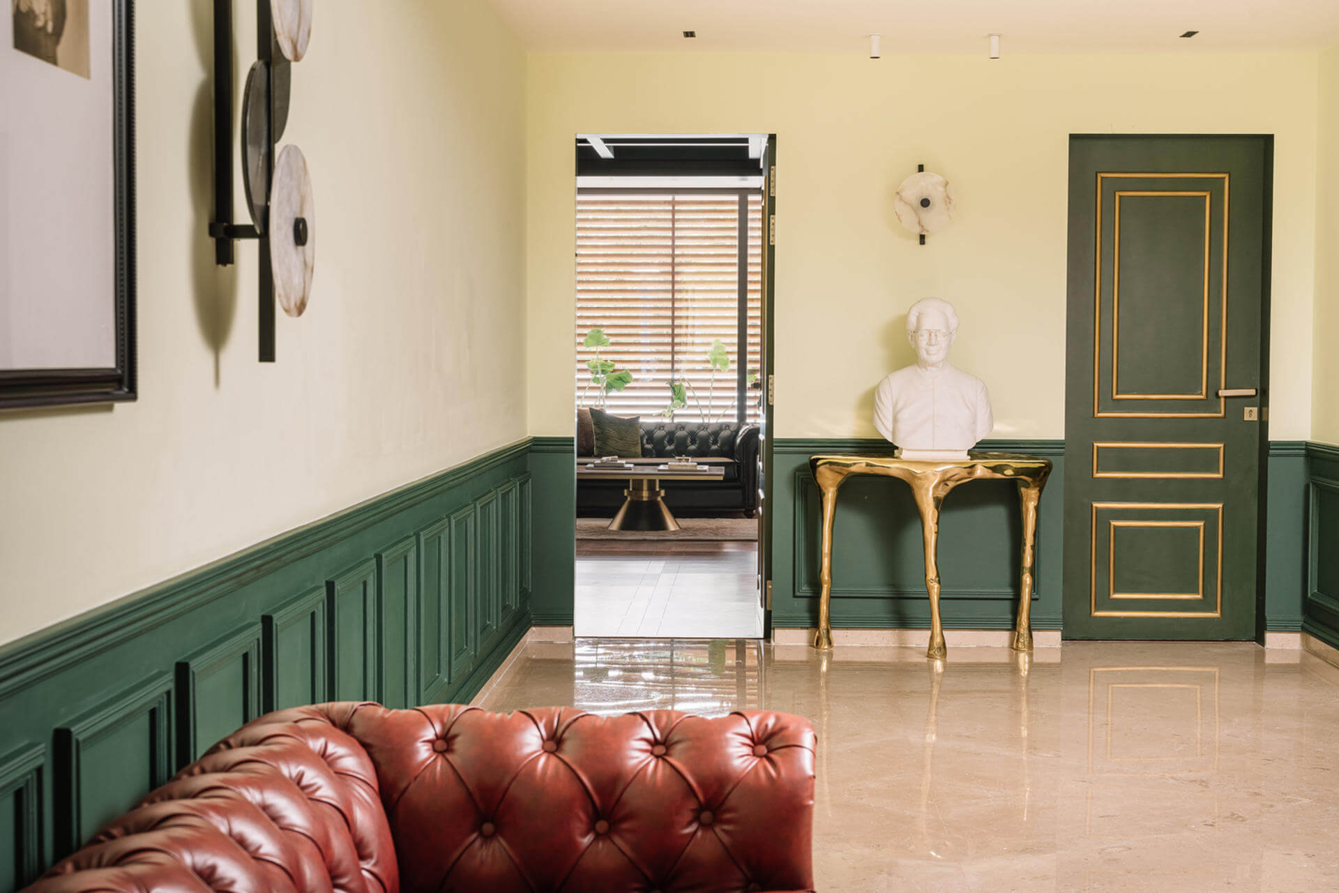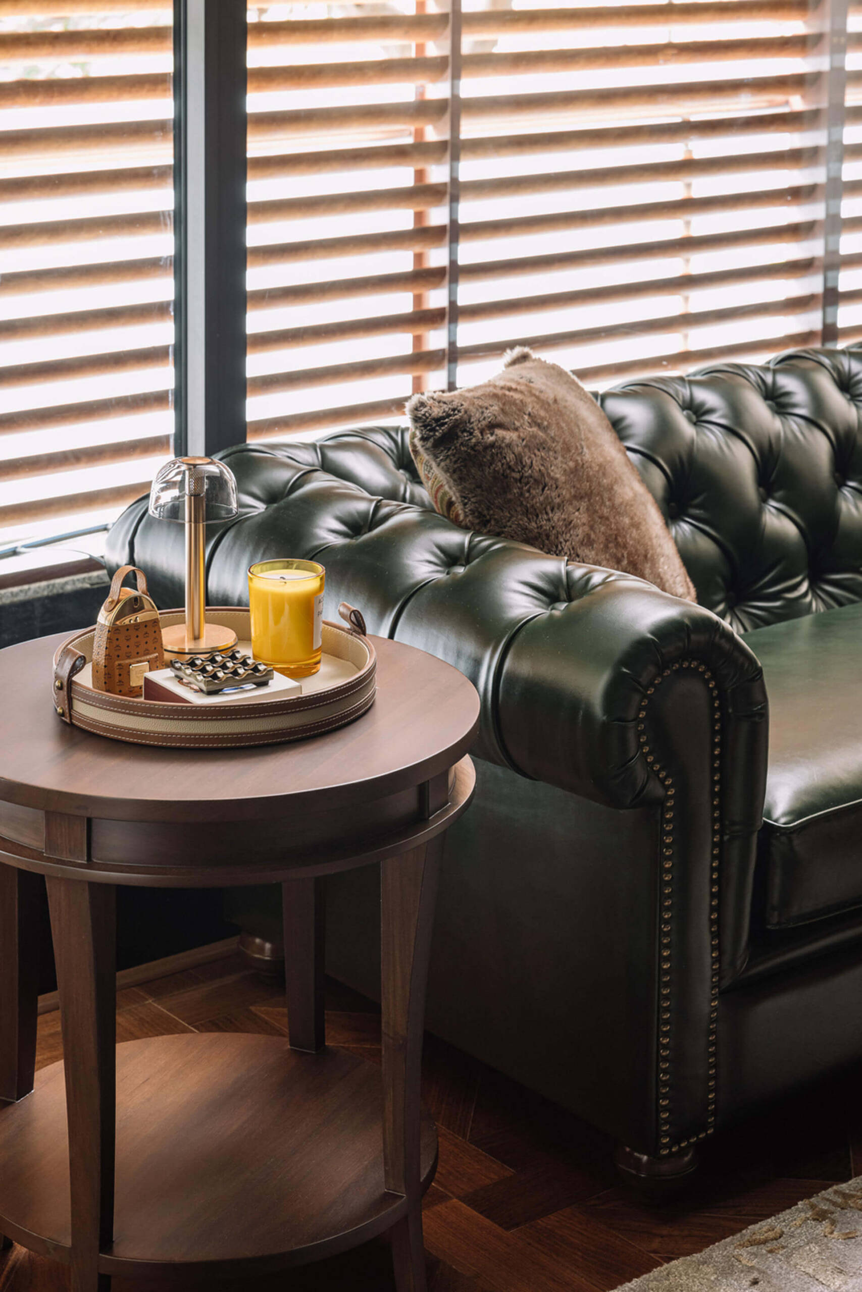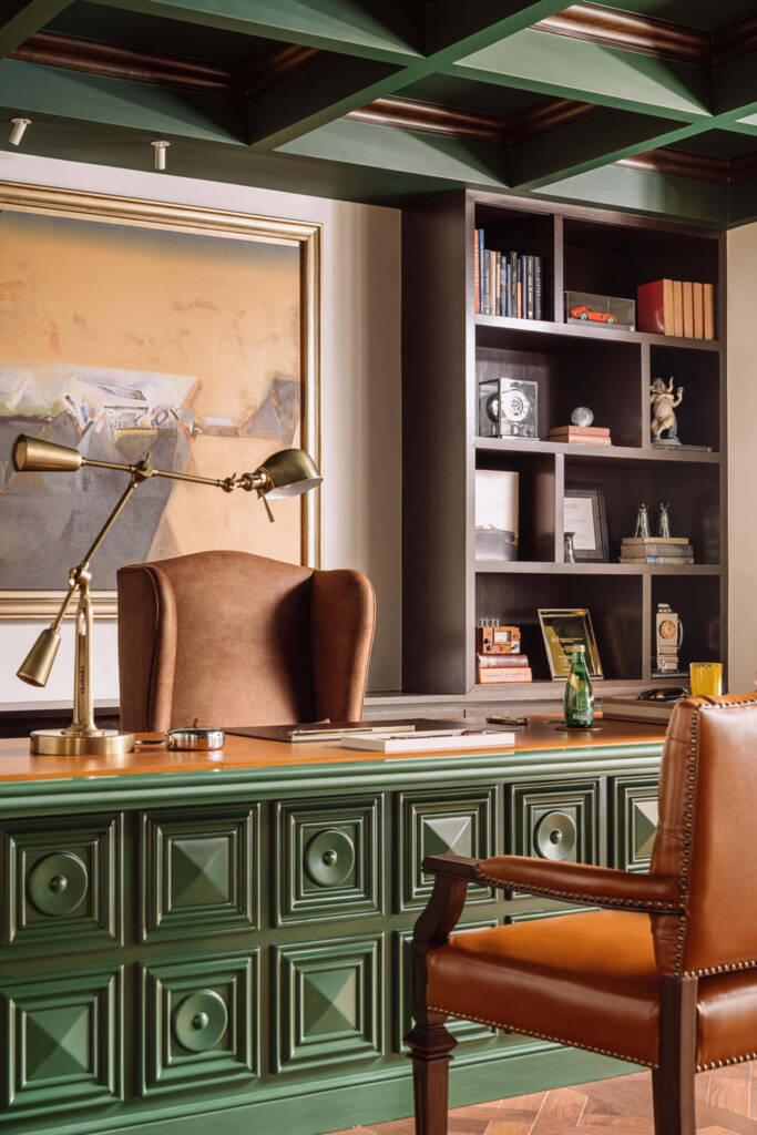 A bold reinterpretation of vintage English charm, this office blends bottle green leather, rustic wood, and personal collectibles to reflect the client’s distinctive style. With custom details, layered textures, and a touch of modern luxury, the space exudes warmth, character, and quiet authority.