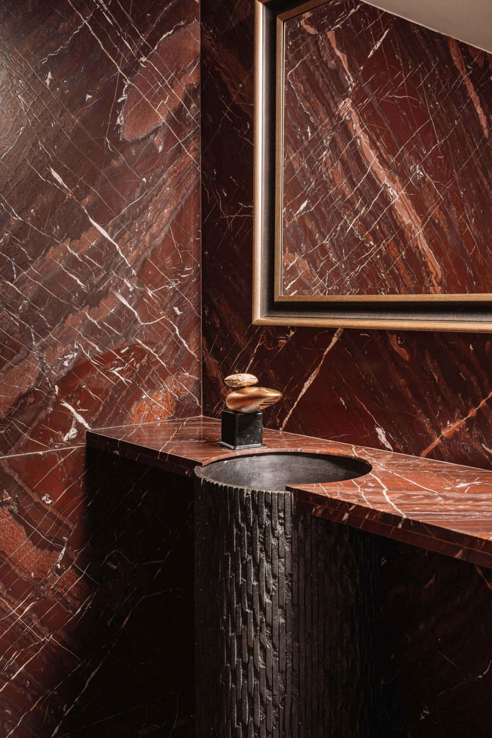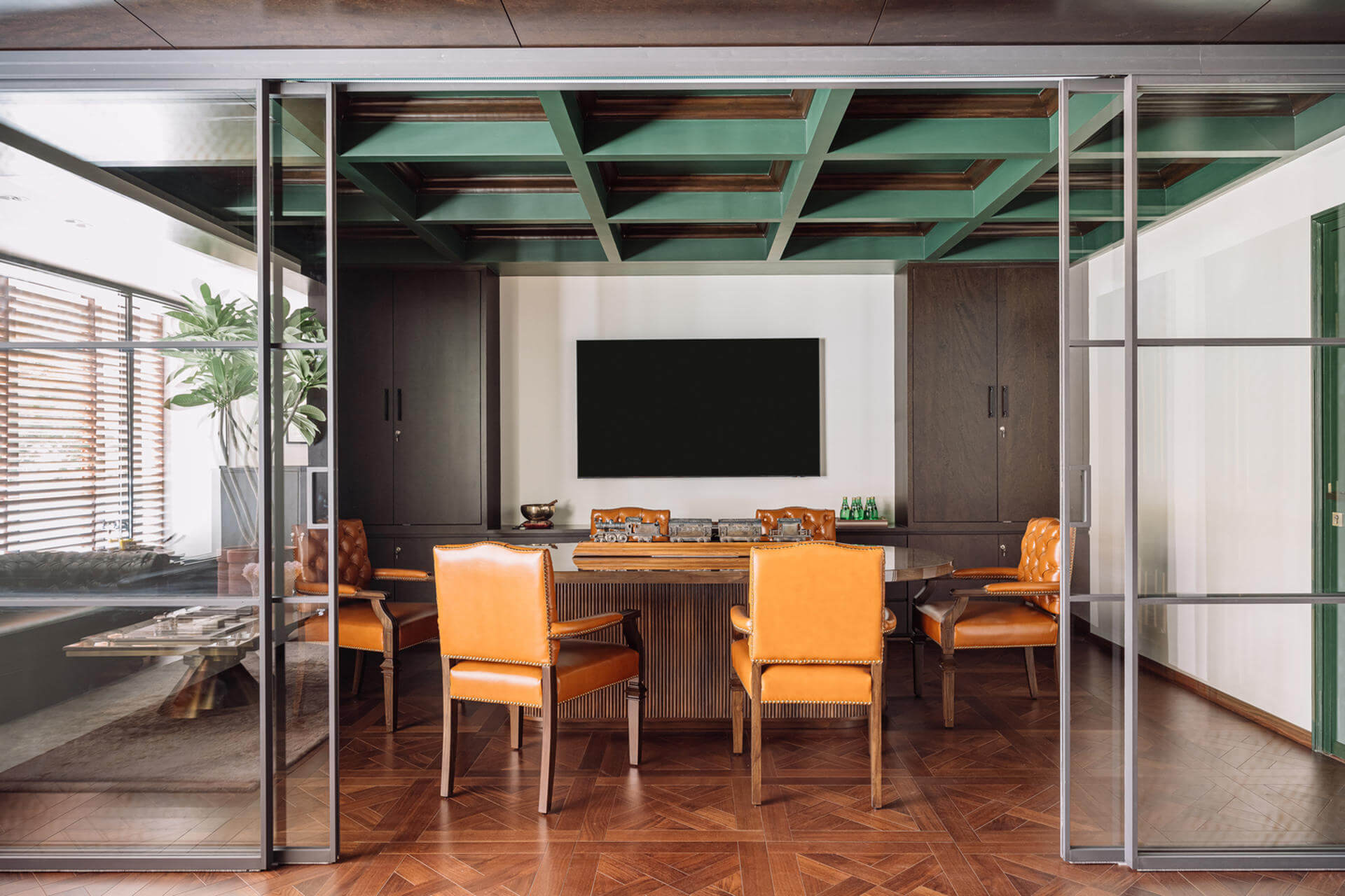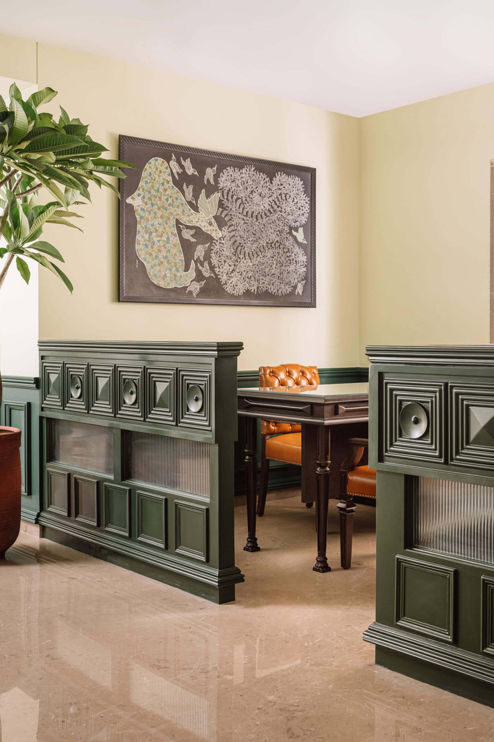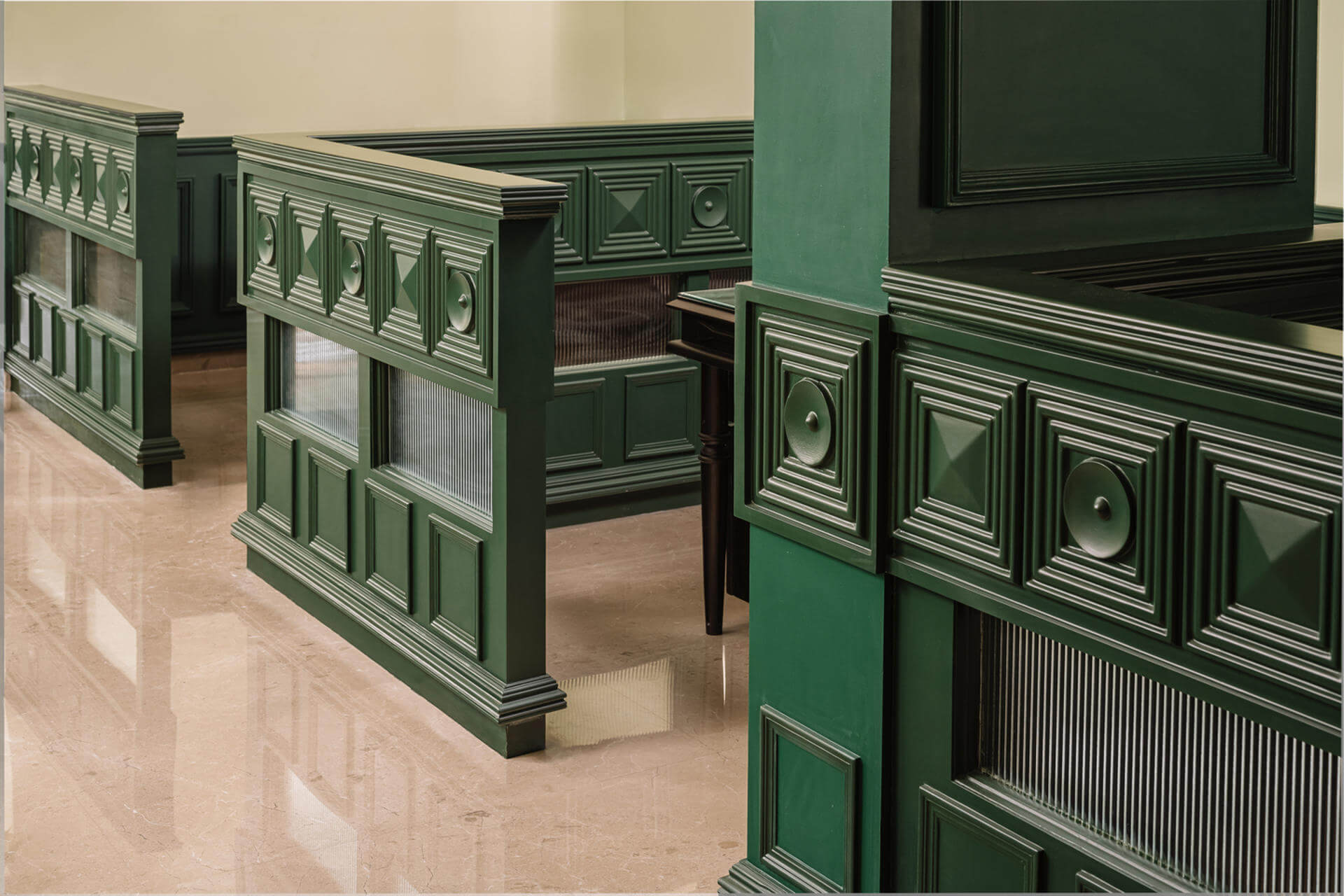 A bold reinterpretation of vintage English charm, this office blends bottle green leather, rustic wood, and personal collectibles to reflect the client’s distinctive style. With custom details, layered textures, and a touch of modern luxury, the space exudes warmth, character, and quiet authority.