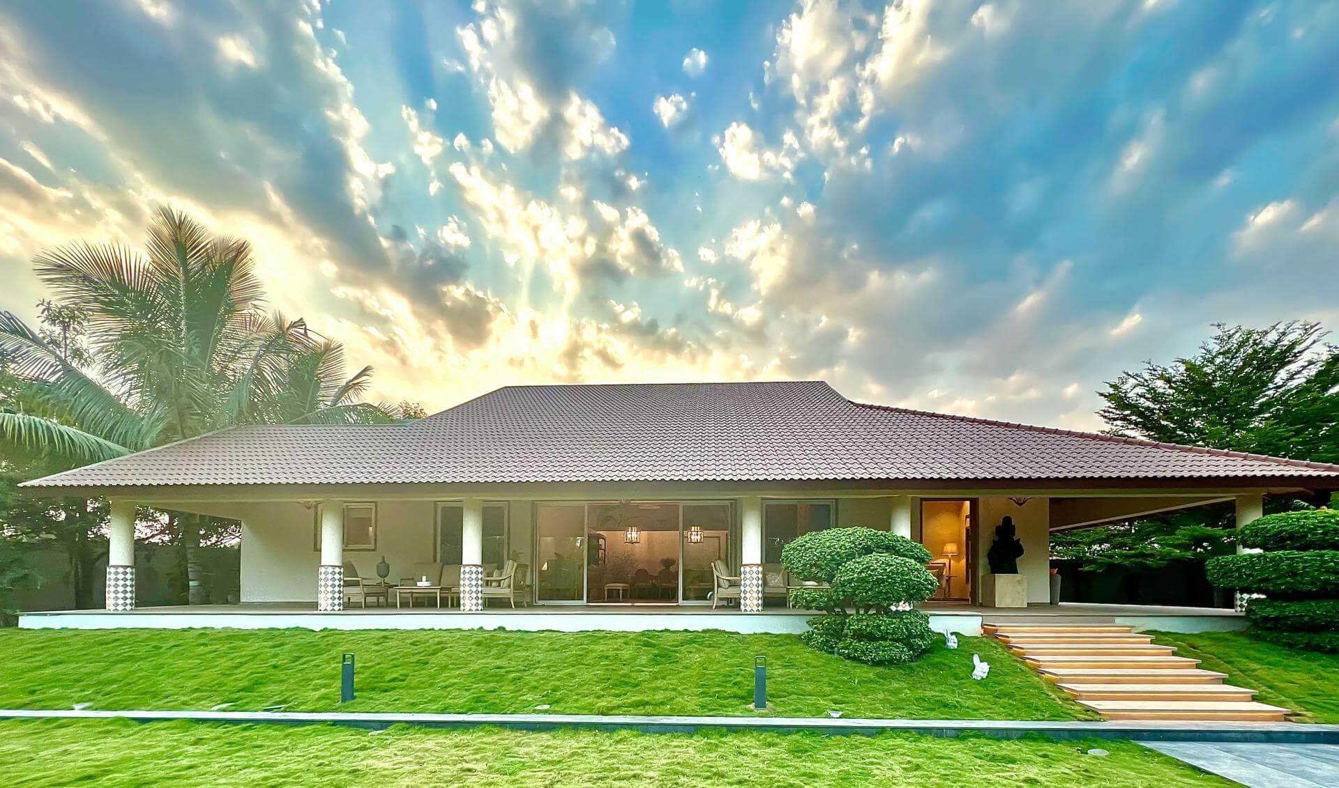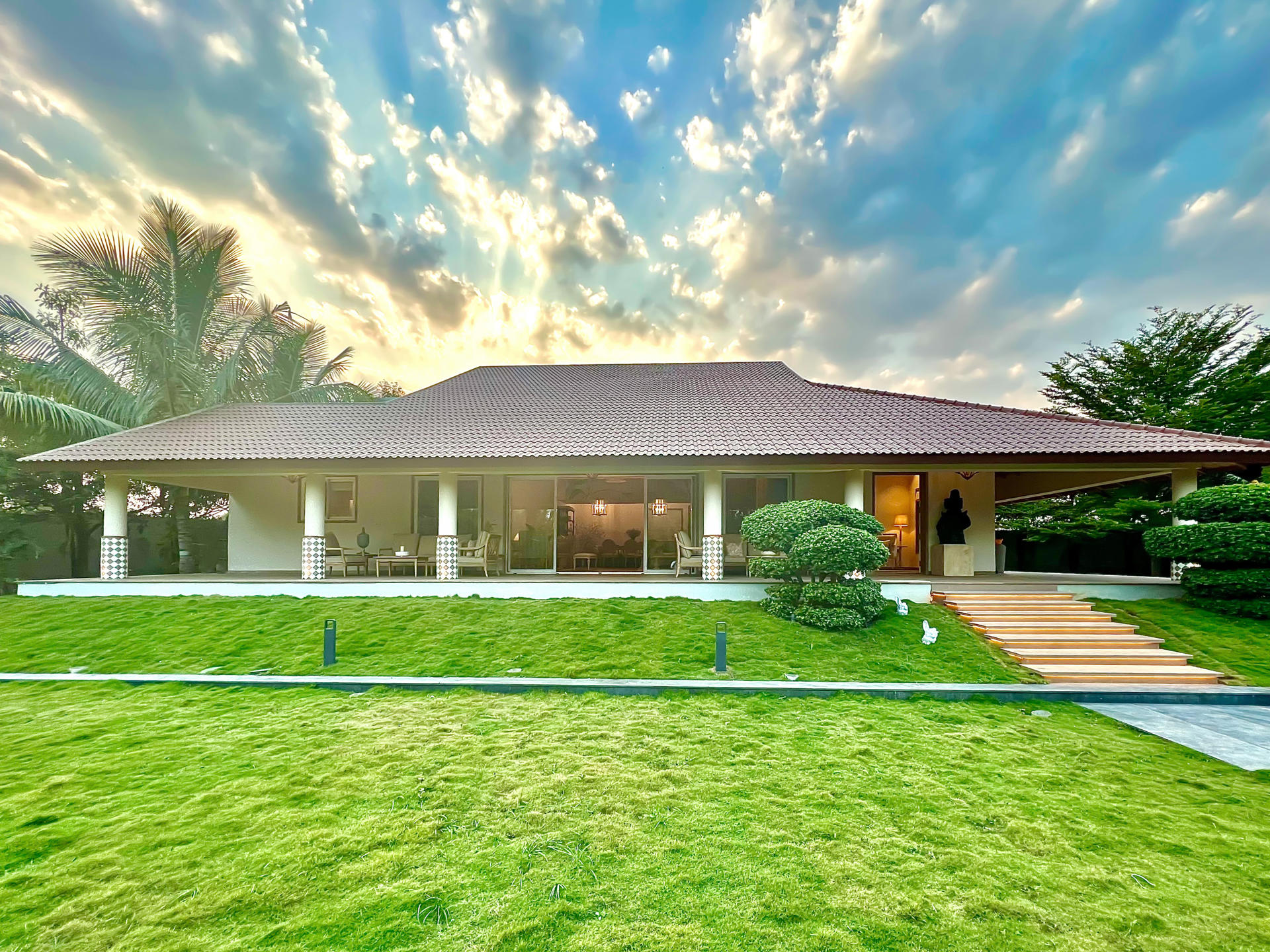 The flooring was a meticulous labor of love that went through many trial and errors to get to this stage! The standard ash grey stone was procured in large sizes, shaped and chiseled in the factory, finished multiple times on all sides with a machine and with sealant and then laid over a few months and finally filled with a white epoxy in between!