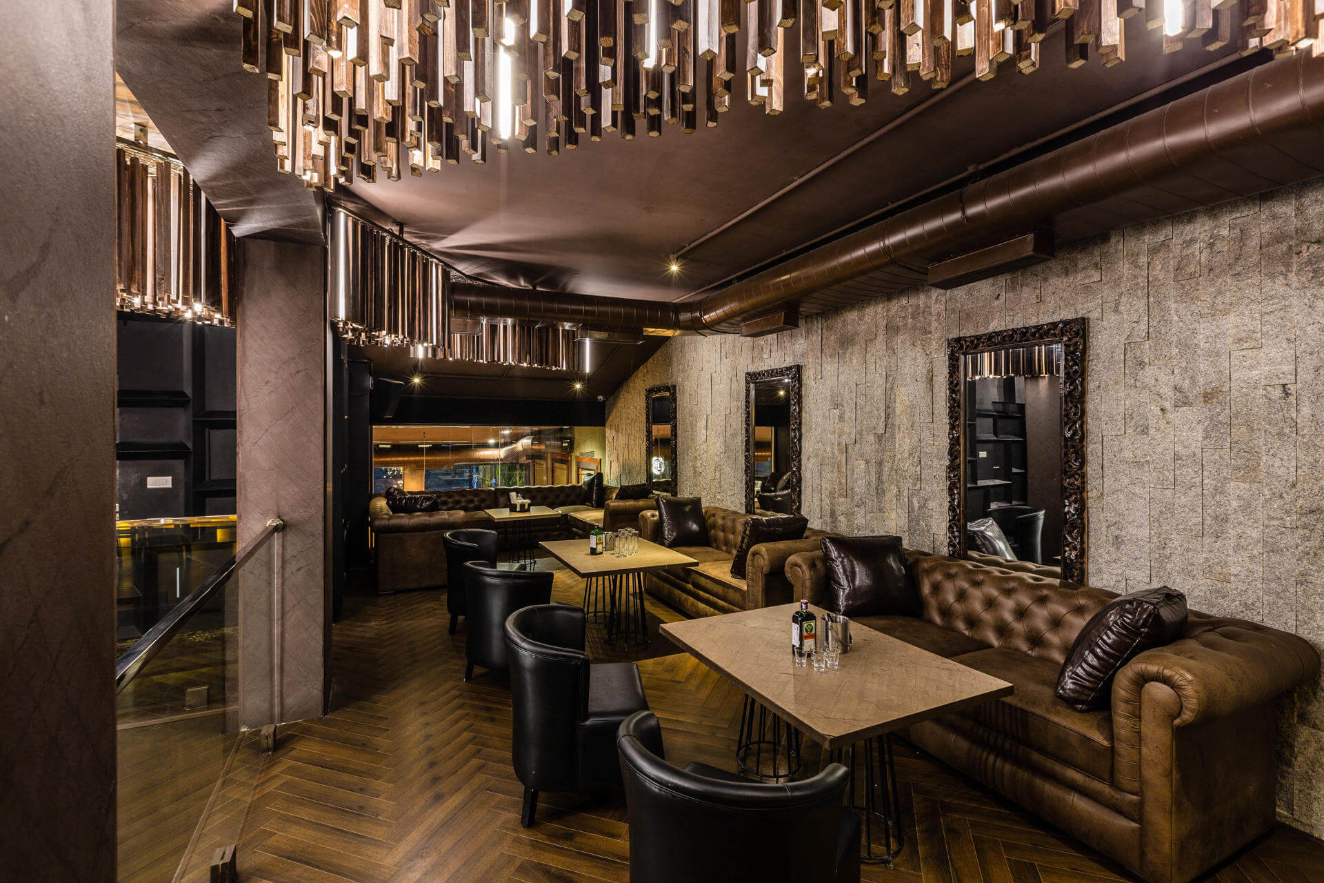 The main challenge here was the height of the space that we tackled with using a black rock wool ceiling and partially gold mirror.