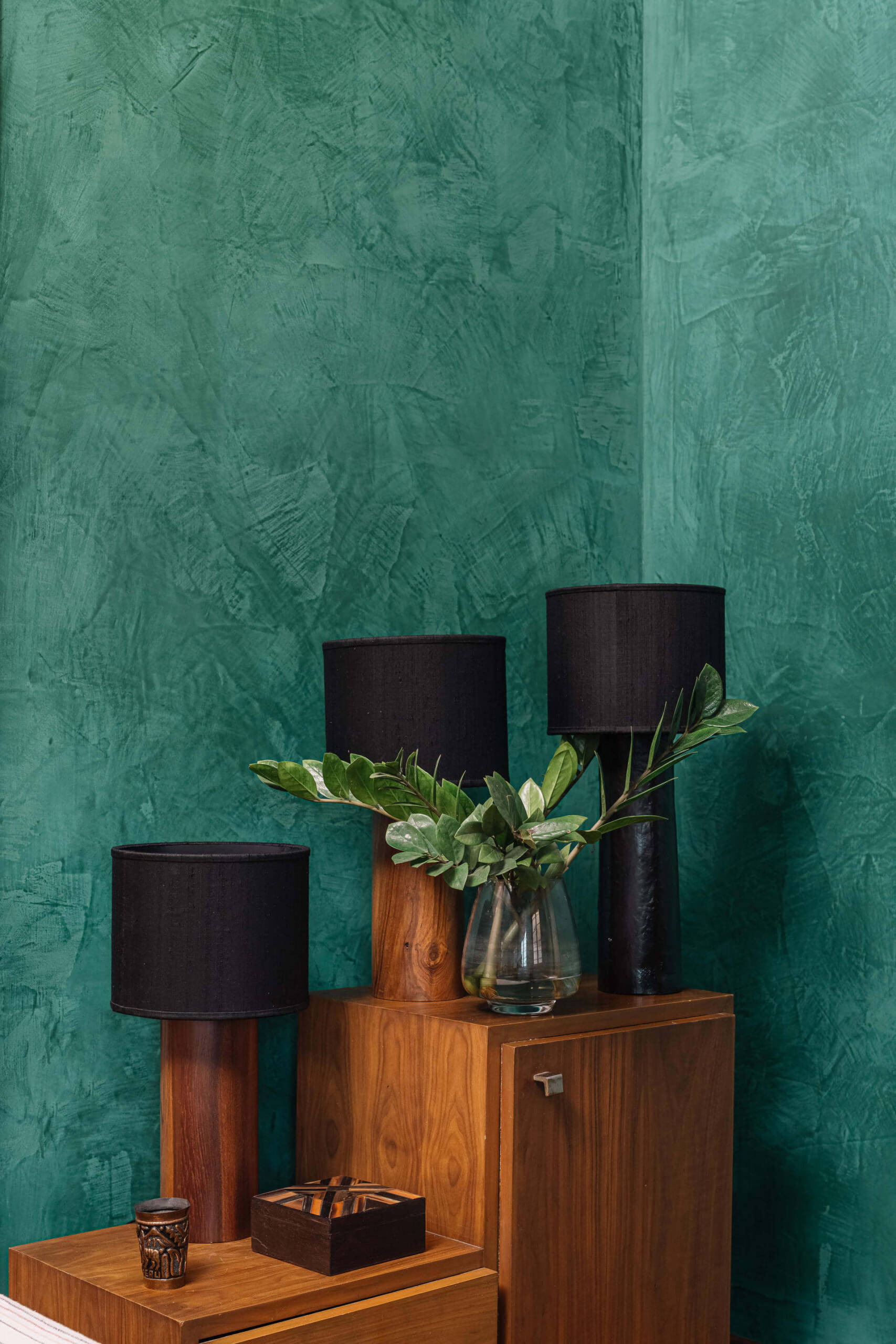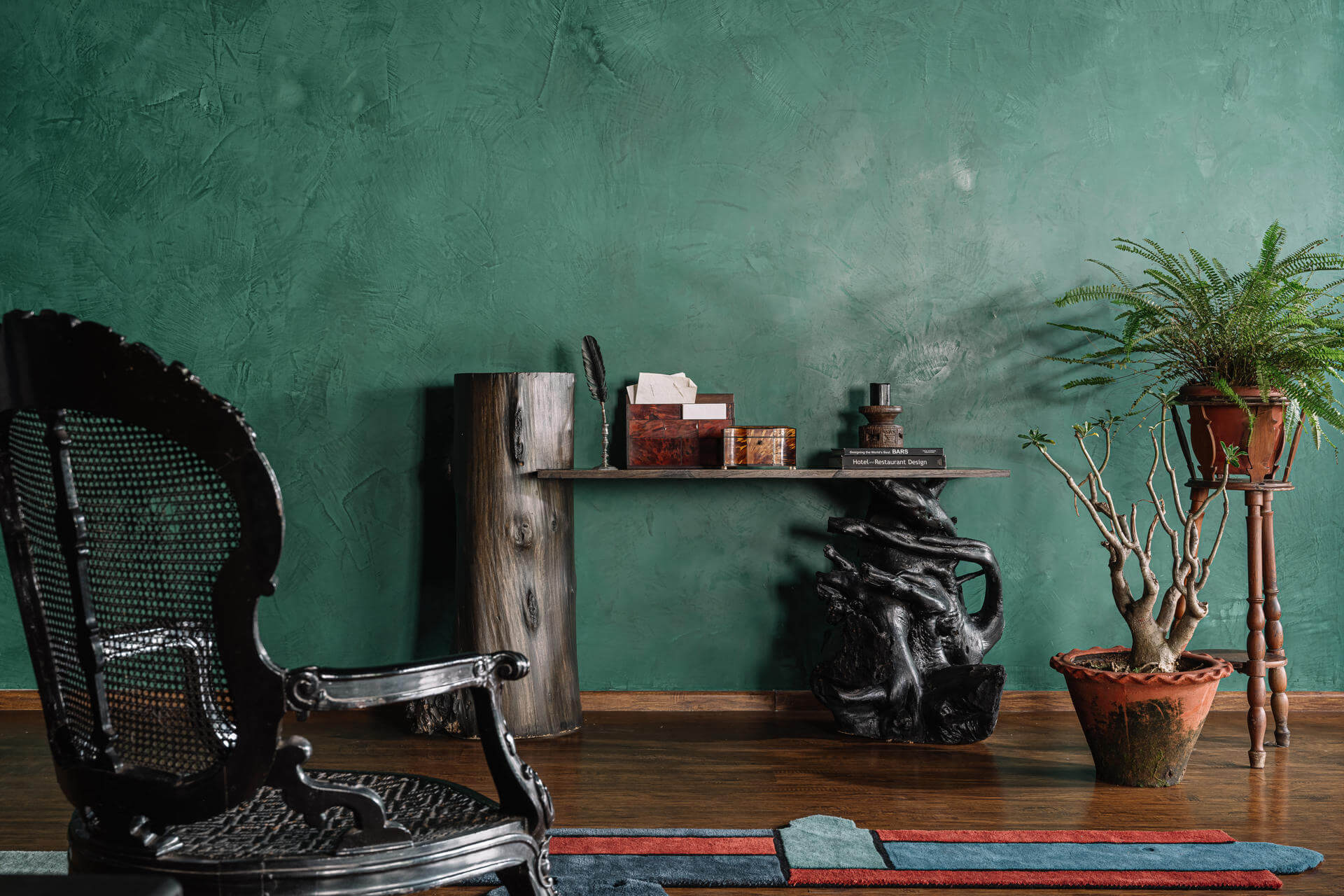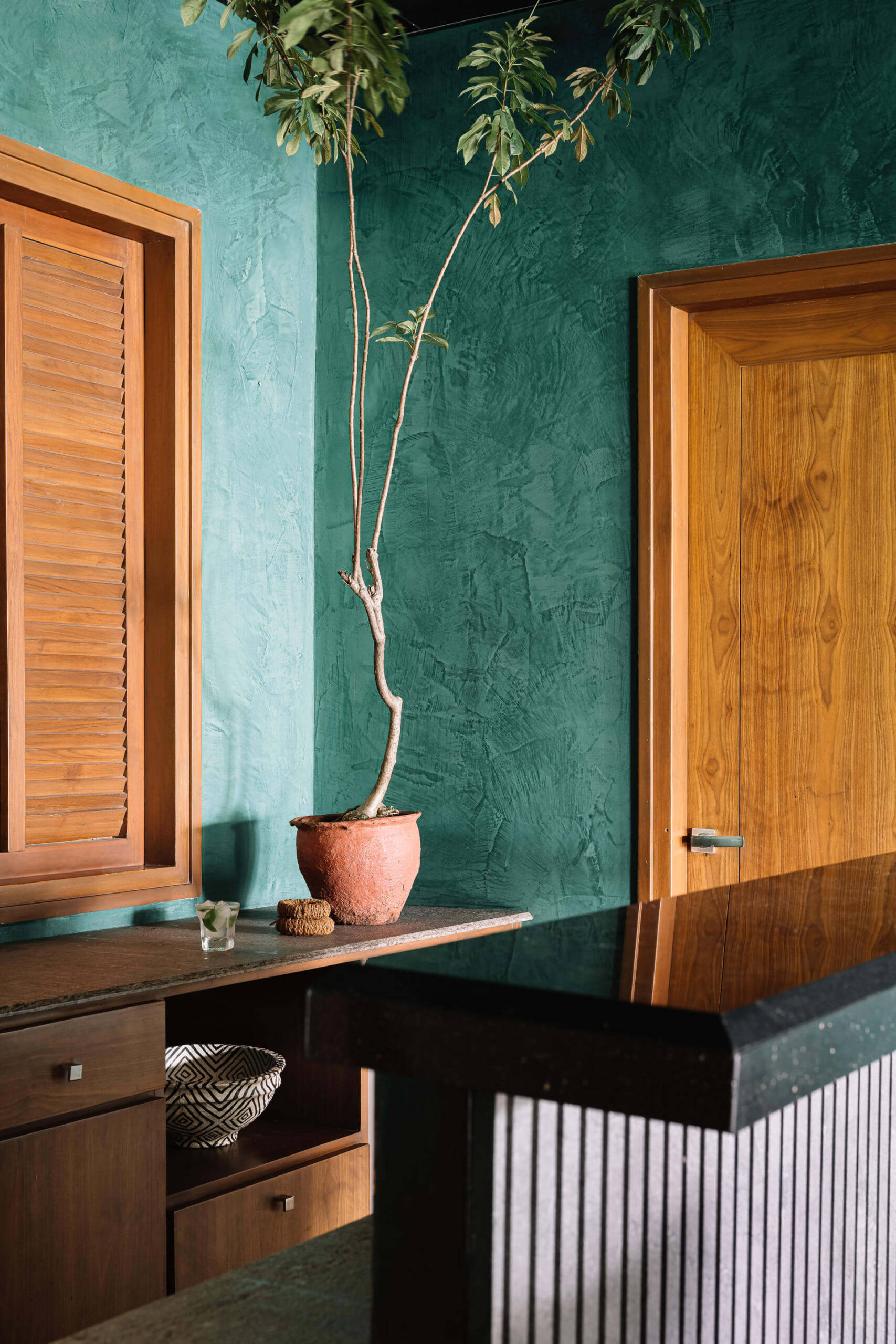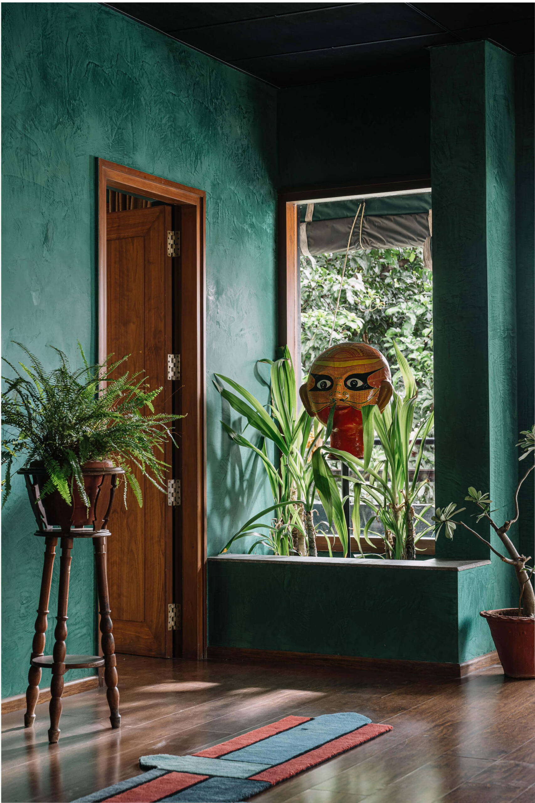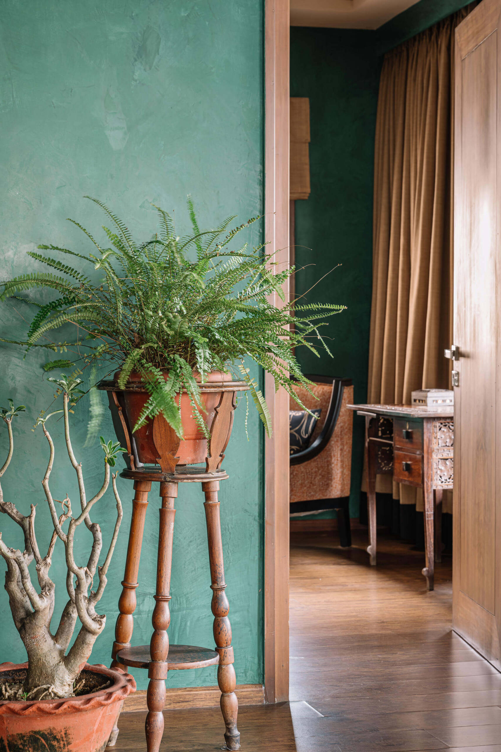 A deeply personal, joy-filled sanctuary—this home reflects bold individuality, moody emerald walls, and story-rich décor. Crafted with sentimental materials, indirect lighting, and sensual contrasts, every detail sparks conversation and emotion. From cyclone-salvaged wood to dramatic textures, the space is a curated celebration of memory, mood, and meaning.