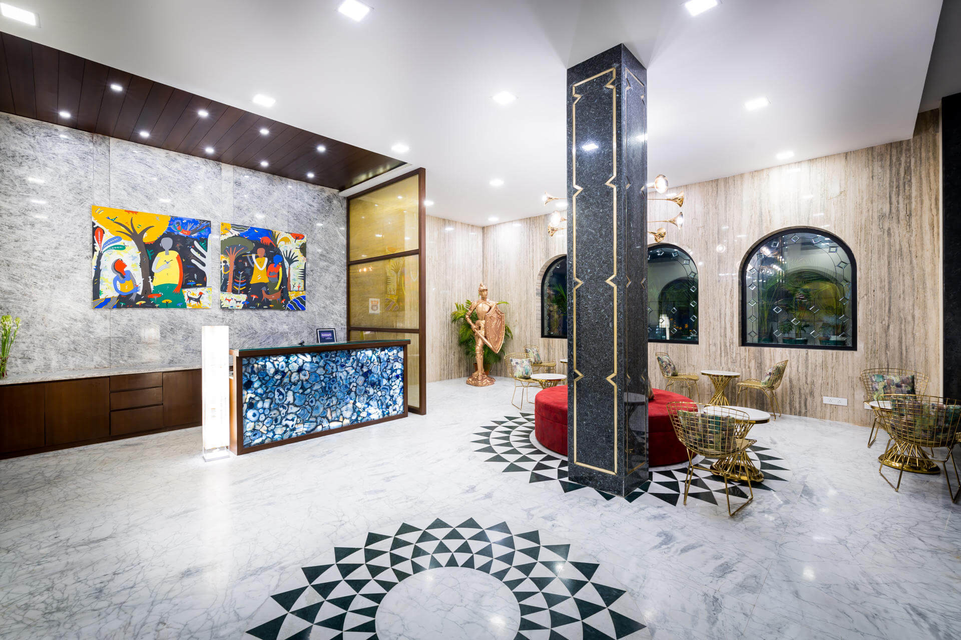 The flooring was a meticulous labor of love that went through many trial and errors to get to this stage! The standard ash grey stone was procured in large sizes, shaped and chiseled in the factory, finished multiple times on all sides with a machine and with sealant and then laid over a few months and finally filled with a white epoxy in between!
